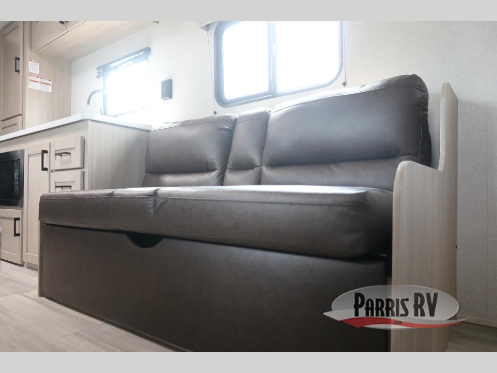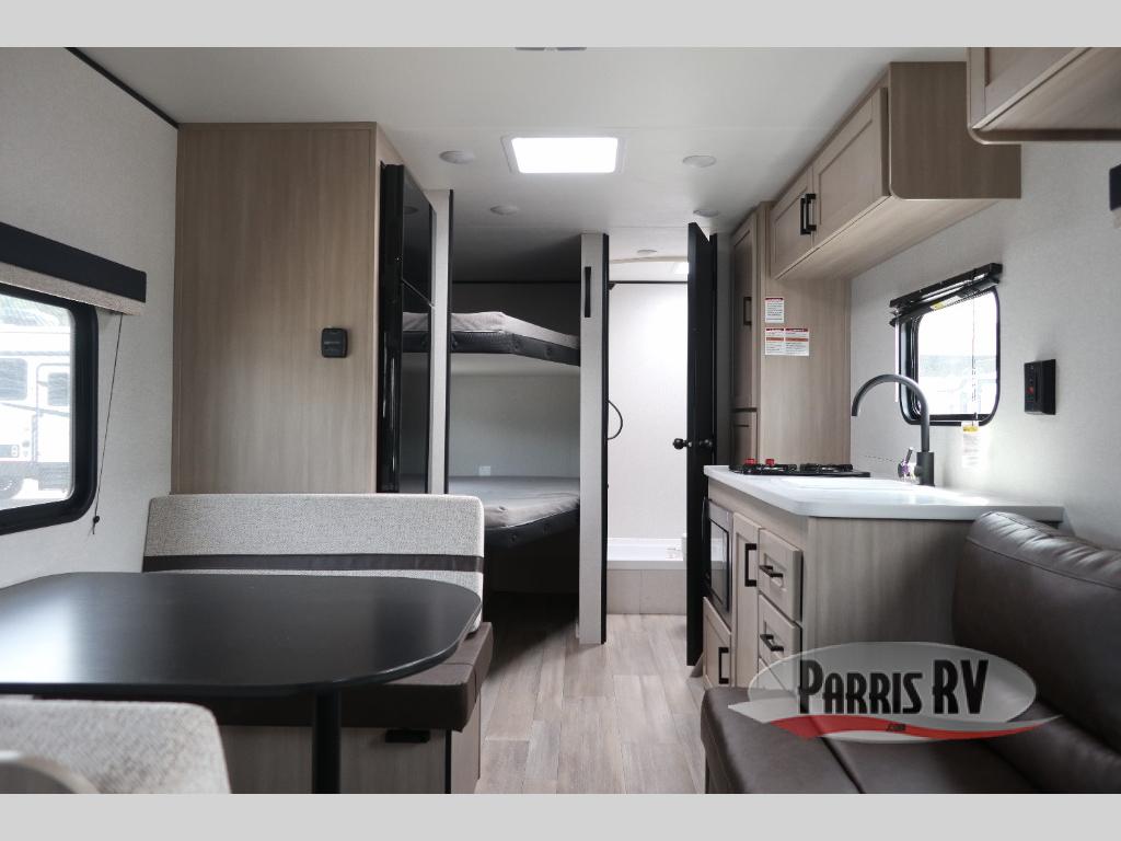 Camping trips are made easy in this Lynx Edition travel trailer with double-size bunk beds for guests or little ones. You'll find a front walk-around queen bed for a great night's rest, along with dual bedside wardrobes to keep your things tidy. The rear corner private bath includes a foot-flush toilet and a 40" shower, so you won't have to leave the camper in the middle of the night. A two-burner cooktop and microwave oven will let you make meals each day, and you'll find seating spaces at the booth dinette or on the sofa!