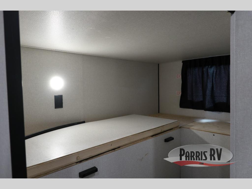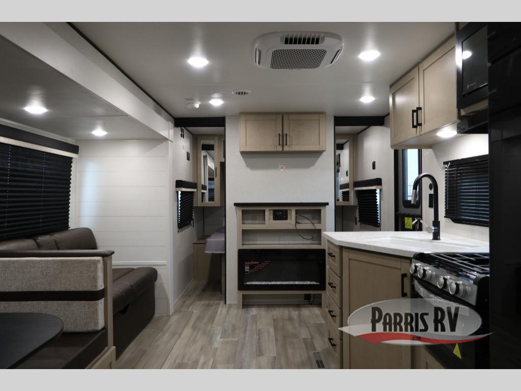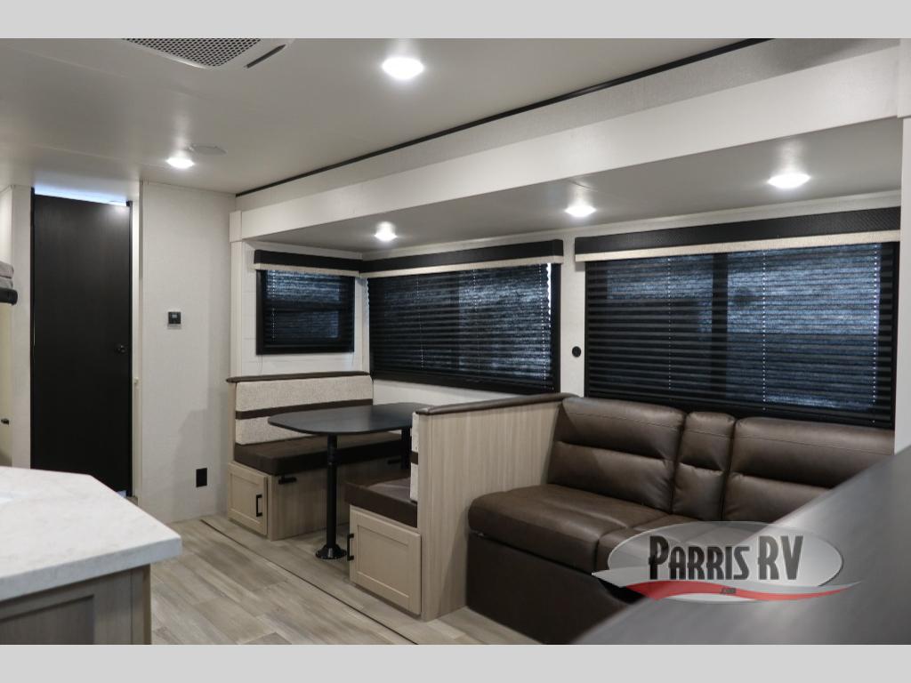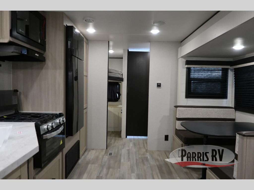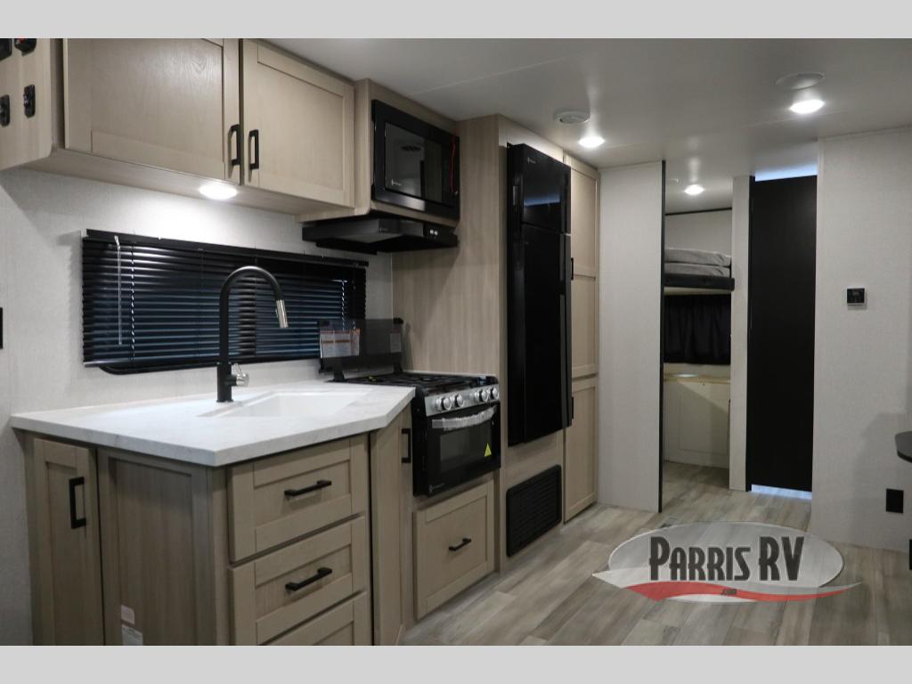 The whole gang will love weekends in the woods with this travel trailer in tow! There is a large slide out for added space, and here you'll find the jack-knife sofa and booth dinette. You can claim the front private bedroom to yourselves, while your guests or little ones take the double-size bunks. A full kitchen is complete with a three-burner cooktop and microwave oven to make meals each day, plus a 12V refrigerator and pantry for food storage. This unit also includes an outdoor kitchen with a refrigerator to keep cold drinks ready to enjoy!
