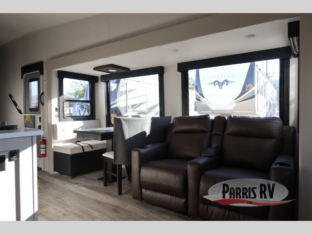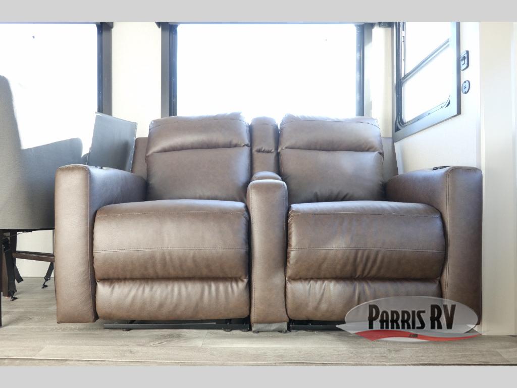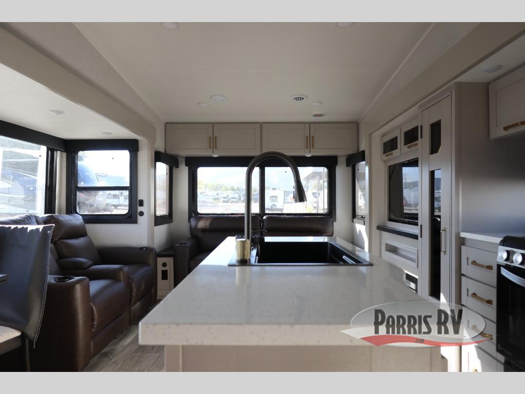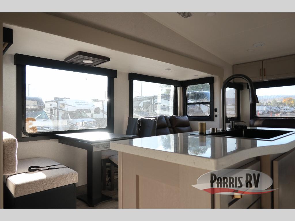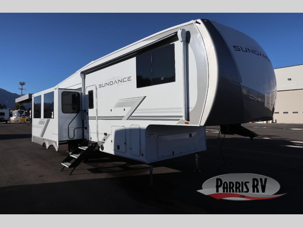 This Sundance Fifth Wheel offers a luxurious living experience on the road! The rear living area is the heart of the RV, featuring a tri-fold sofa that's perfect for relaxation and entertainment. The theater seating provides ample seating for family and friends, while the entertainment center offers endless entertainment options. The kitchen is equipped with a pantry, a kitchen island that offers additional counter space and storage, a refrigerator, a sink that's conveniently located for food preparation and cleanup, and a microwave. Plus, a table with chairs and a bench seat offers a comfortable dining space. The full bathroom is designed for comfort and convenience, providing a private space for personal care. The serene front bedroom features an Olympic bed that provides a comfortable sleeping space