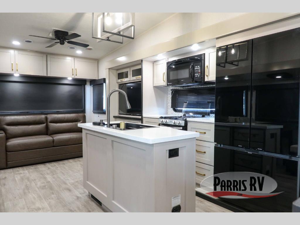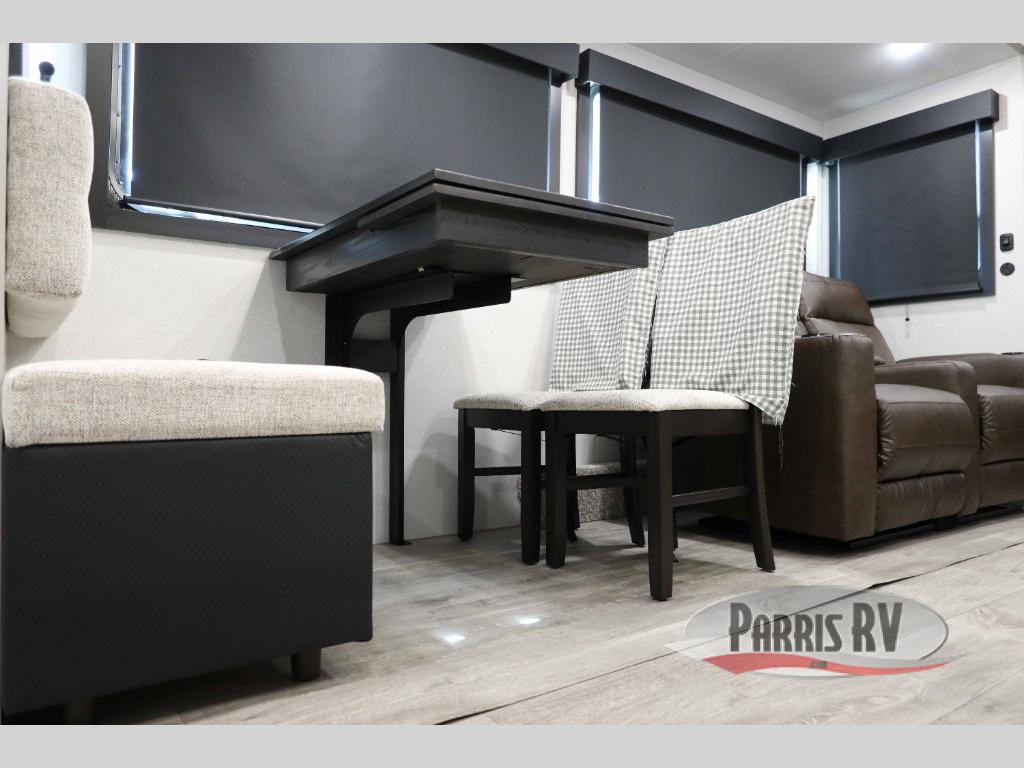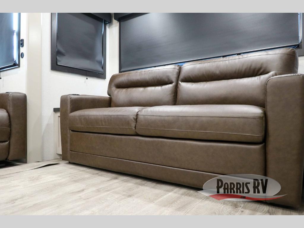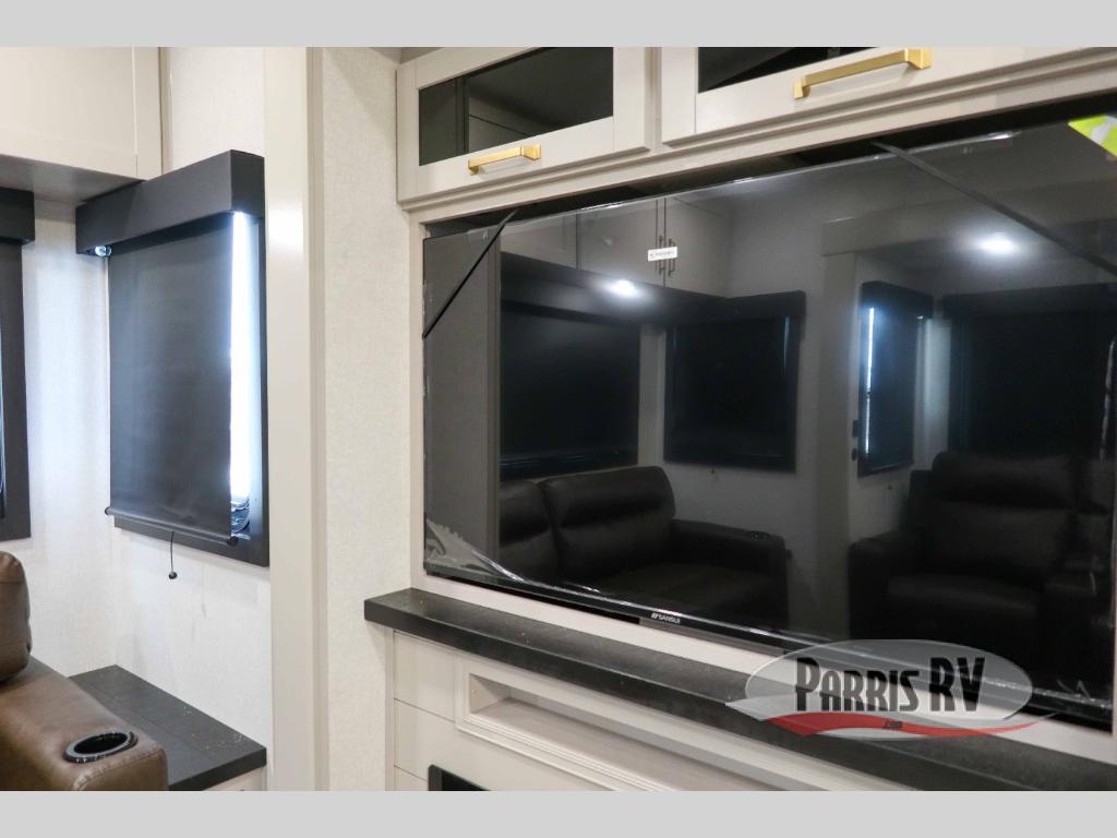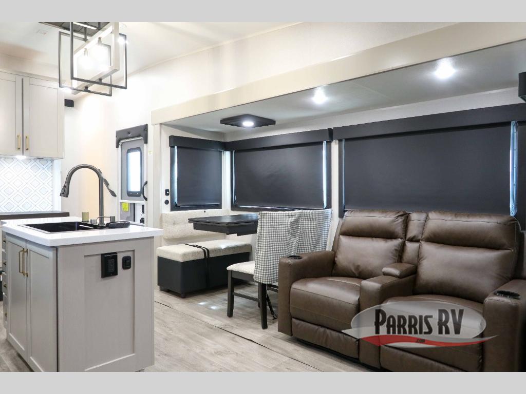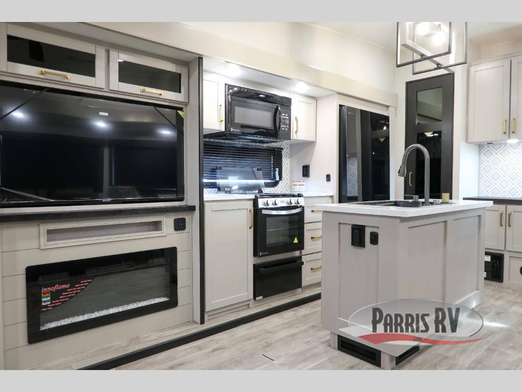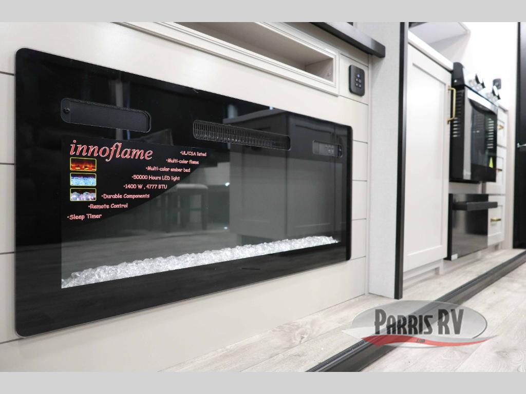 This RV offers a luxurious living experience on the road. The rear living area boasts a tri-fold sofa, a theater sofa that provides ample seating for relaxation and entertainment, and the entertainment center with a fireplace is the perfect spot to unwind on chilly evenings, while the ceiling fan keeps the air circulating on warm days. The kitchen is equipped with a kitchen island that provides additional counter space and storage, a microwave, a 12V refrigerator, a table with chairs and a bench seat that offers a comfortable dining space. Plus, the hutch and pantry provide ample storage for dishes, cookware, and food. The full bathroom is designed for comfort and convenience. The front bedroom is a serene retreat, featuring a king bed and a dresser that provide a comfortable sleeping space for sleeping tight all night long.