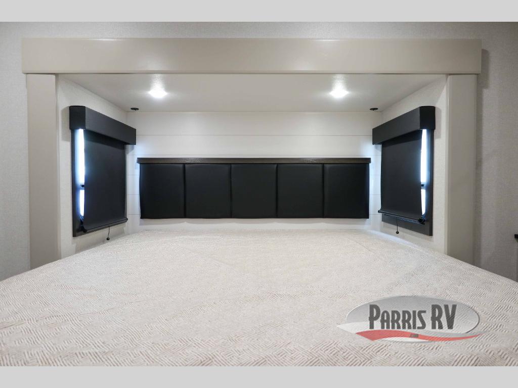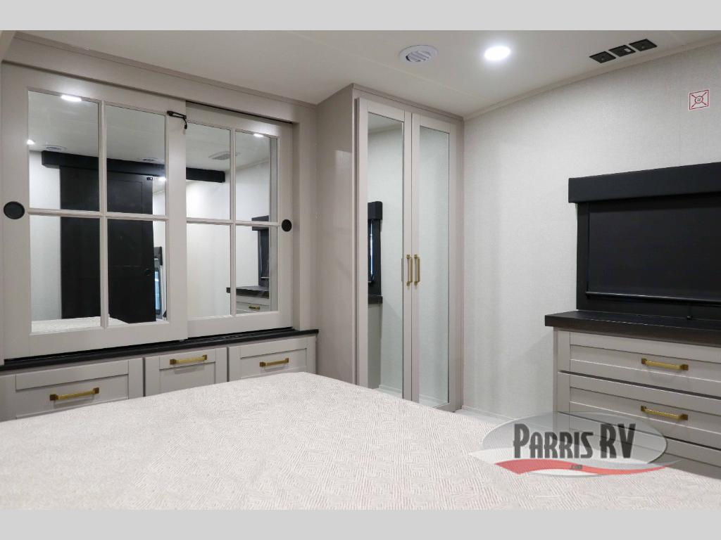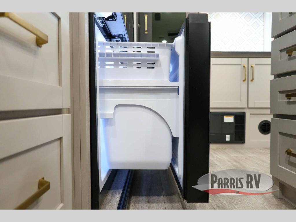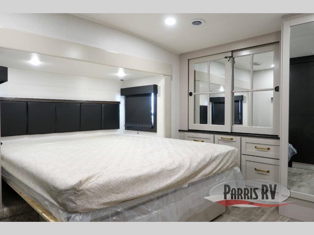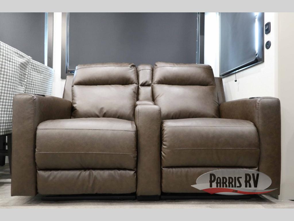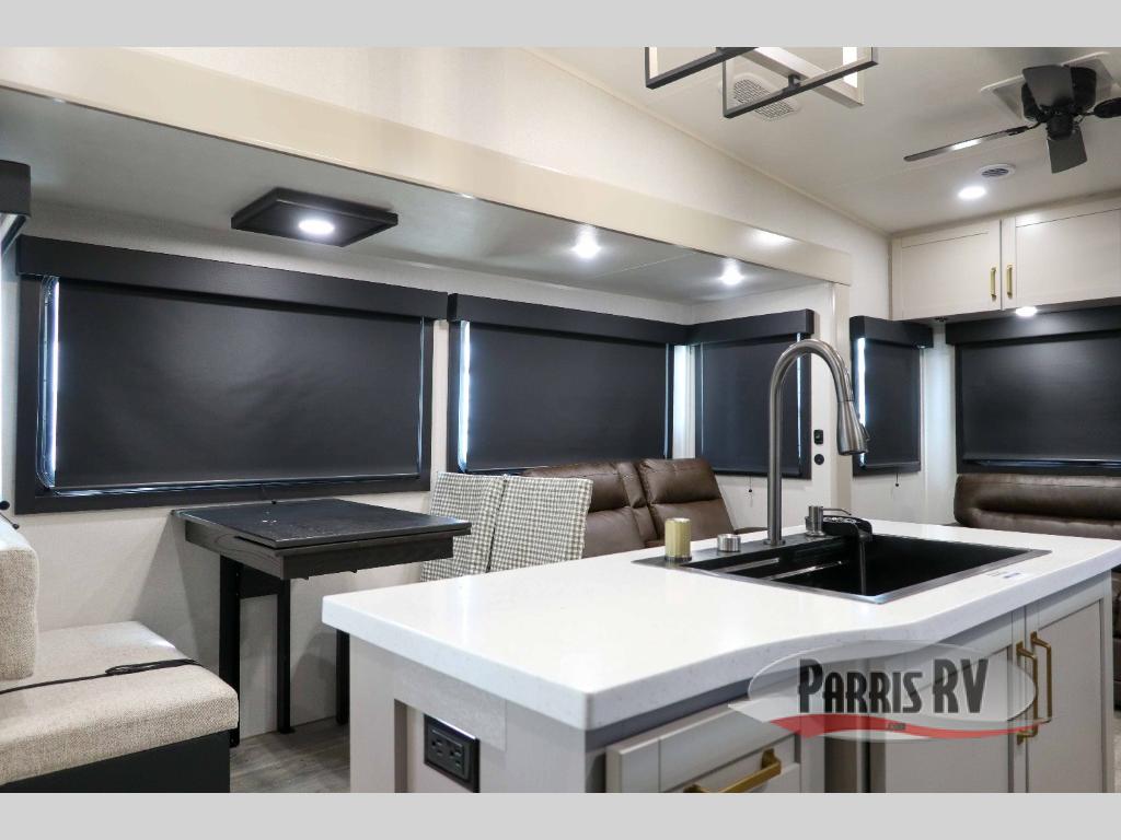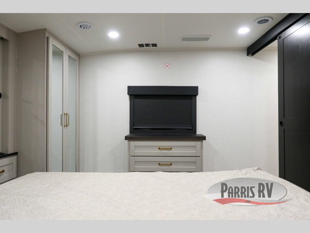 This RV offers a luxurious living experience on the road. The rear living area boasts a tri-fold sofa, a theater sofa that provides ample seating for relaxation and entertainment, and the entertainment center with a fireplace is the perfect spot to unwind on chilly evenings, while the ceiling fan keeps the air circulating on warm days. The kitchen is equipped with a kitchen island that provides additional counter space and storage, a microwave, a 12V refrigerator, a table with chairs and a bench seat that offers a comfortable dining space. Plus, the hutch and pantry provide ample storage for dishes, cookware, and food. The full bathroom is designed for comfort and convenience. The front bedroom is a serene retreat, featuring a king bed and a dresser that provide a comfortable sleeping space for sleeping tight all night long.