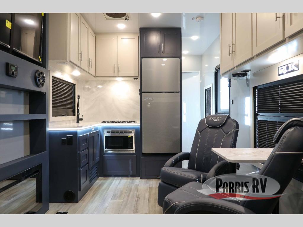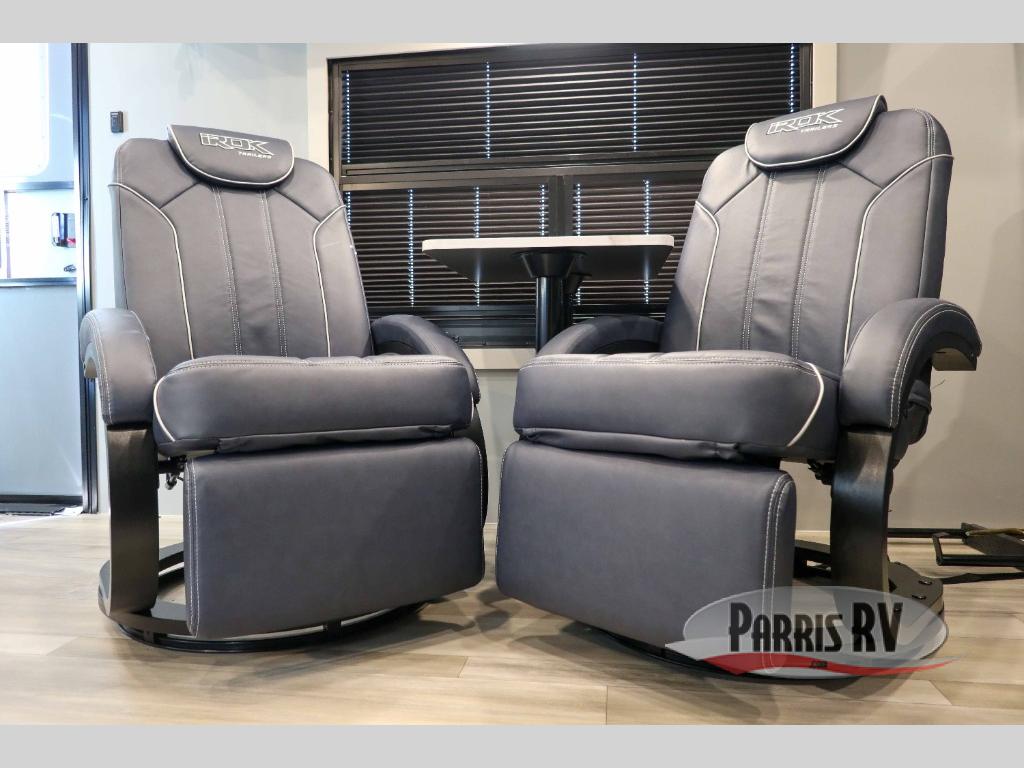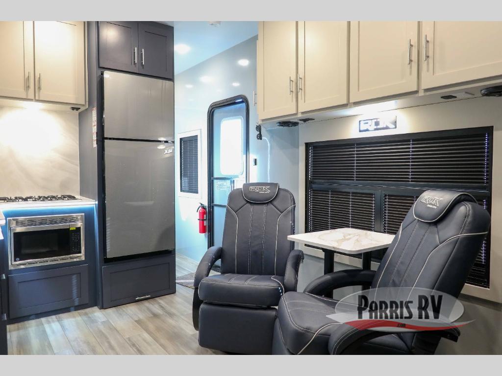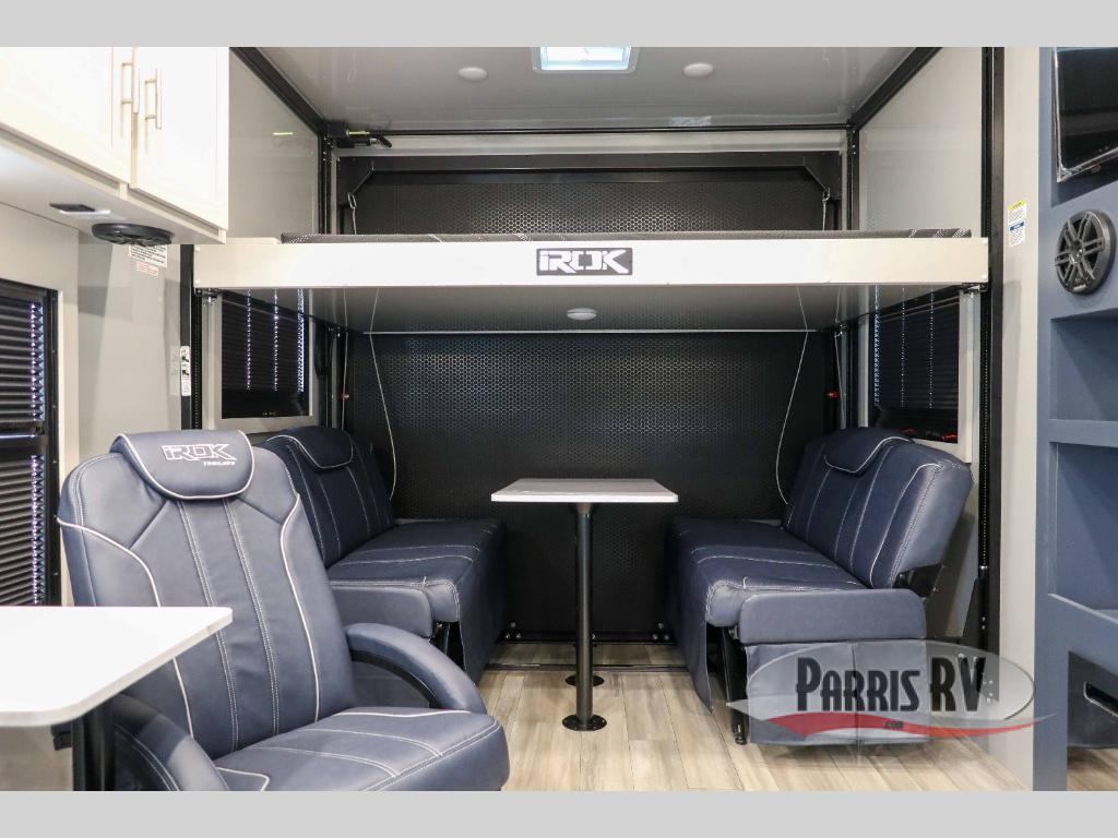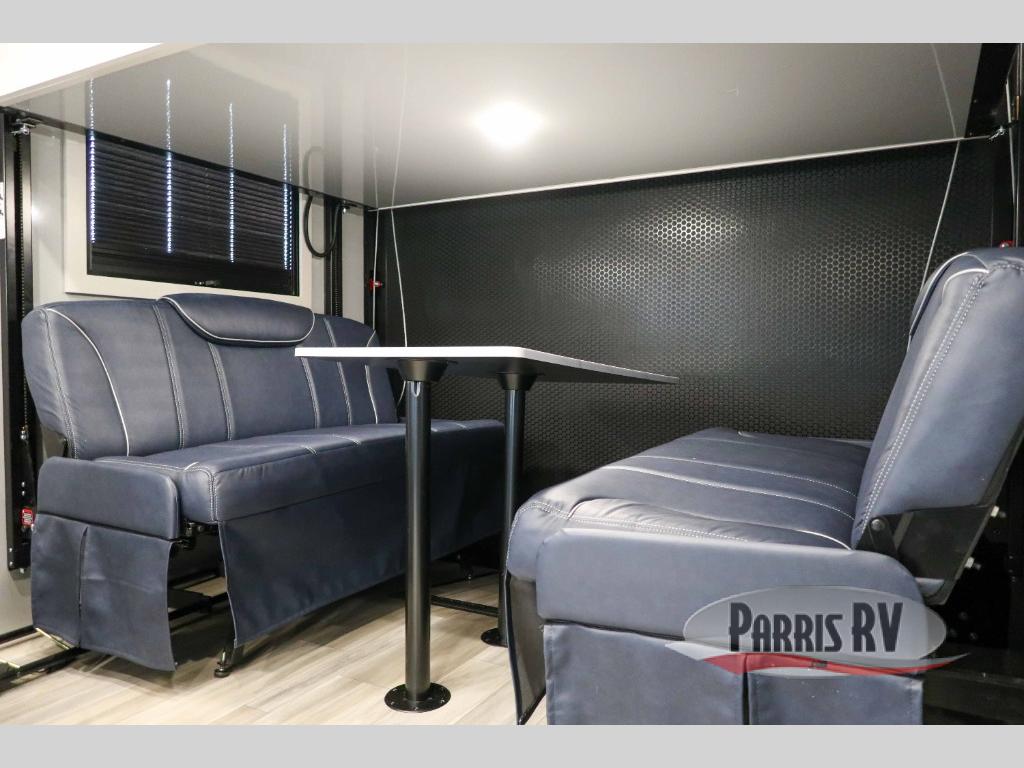 Pack your bags and head for the campground in this luxury toy hauler! You will love having your own bedroom up front with a 70" x 80" king bed, dual nightstands and wardrobes, plus overhead storage. If you have any guests staying over, they can sleep on the drop-down queen bed or bottom power dinette. A three-burner gas cooktop and 10.7 cu. ft. 12V refrigerator will let you cook and store food, and the full bath onboard means you won't have to leave the camper in the middle of the night! There is also a lounge chair with a table where you can relax with a book in the evenings or your coffee in the morning!