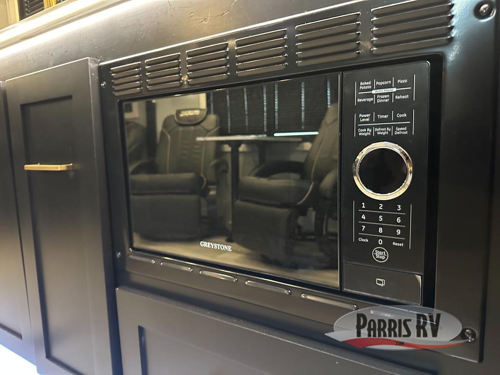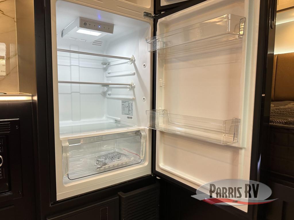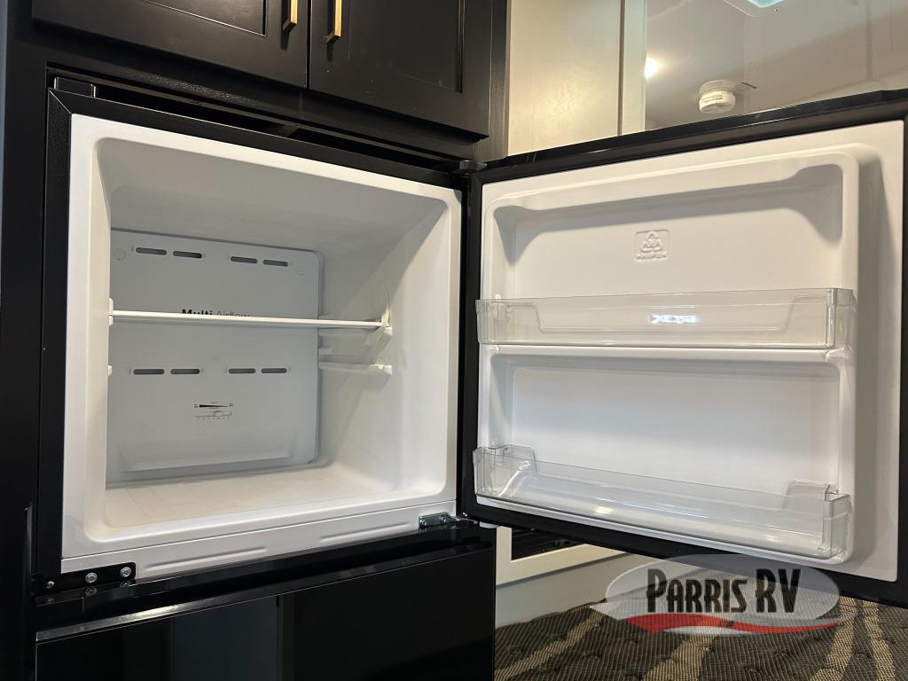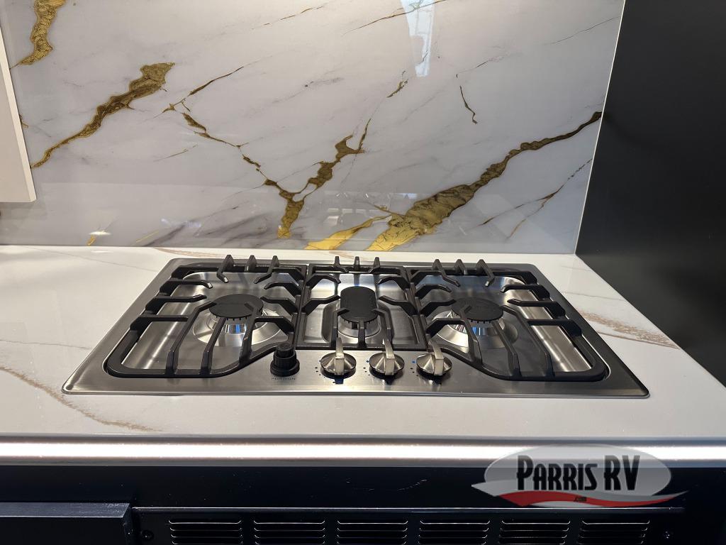 You can't go wrong when camping in this luxury toy hauler. The front of the unit is shared with the side sleeper/54" x 80" bed and full bath for added convenience. You will also find a bedside wardrobe and overhead cabinet to keep your things tidy. If you have any guests staying over, they can sleep on the drop-down queen bed or the bottom power dinette. There is also a three-burner gas cooktop in the kitchen so you can make meals each day, plus an 8-cu. ft. 12V refrigerator to keep food fresh!