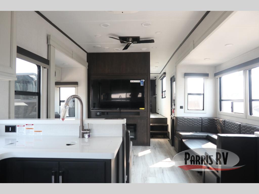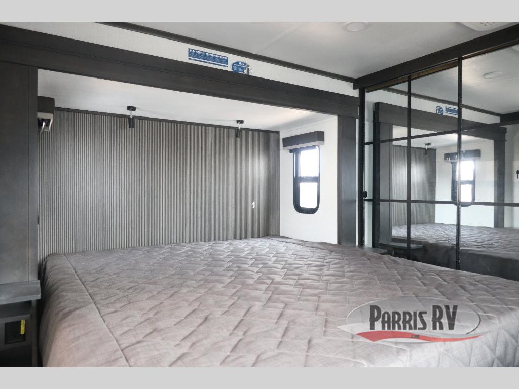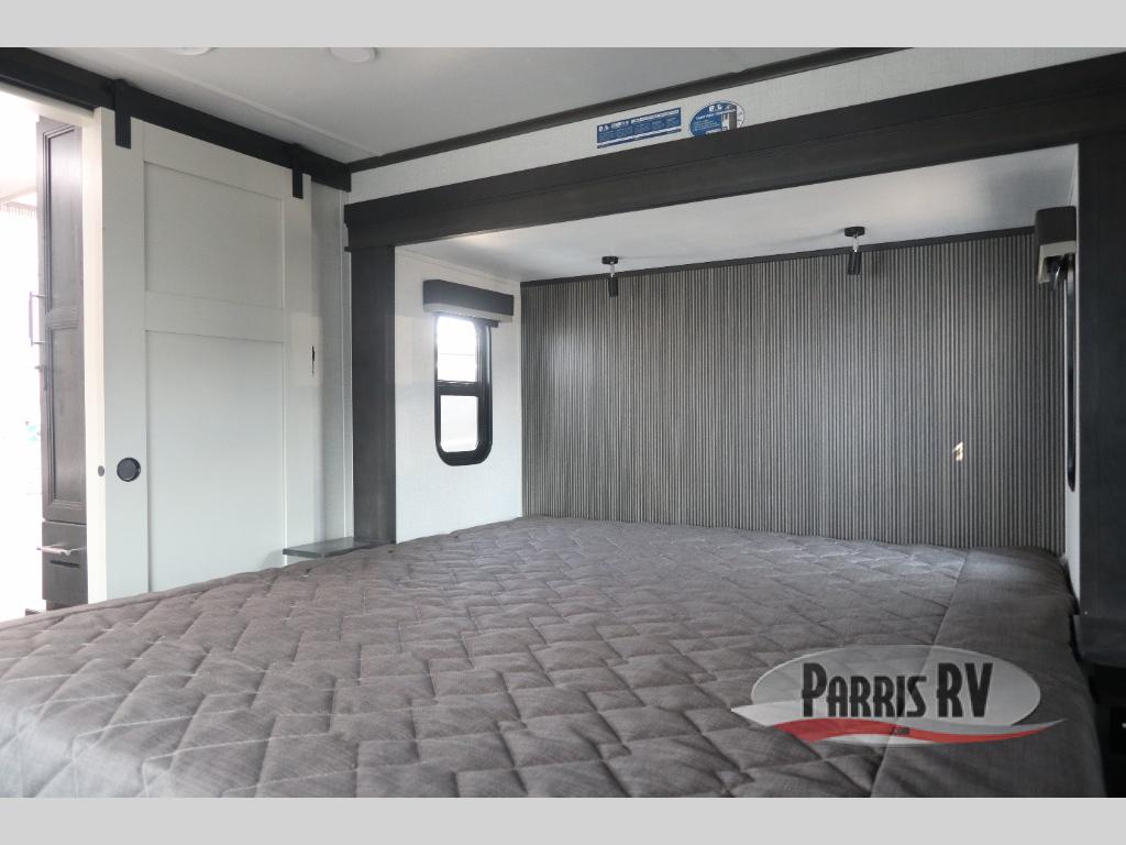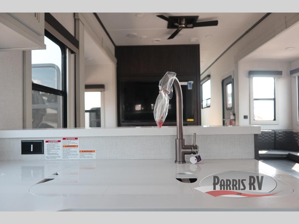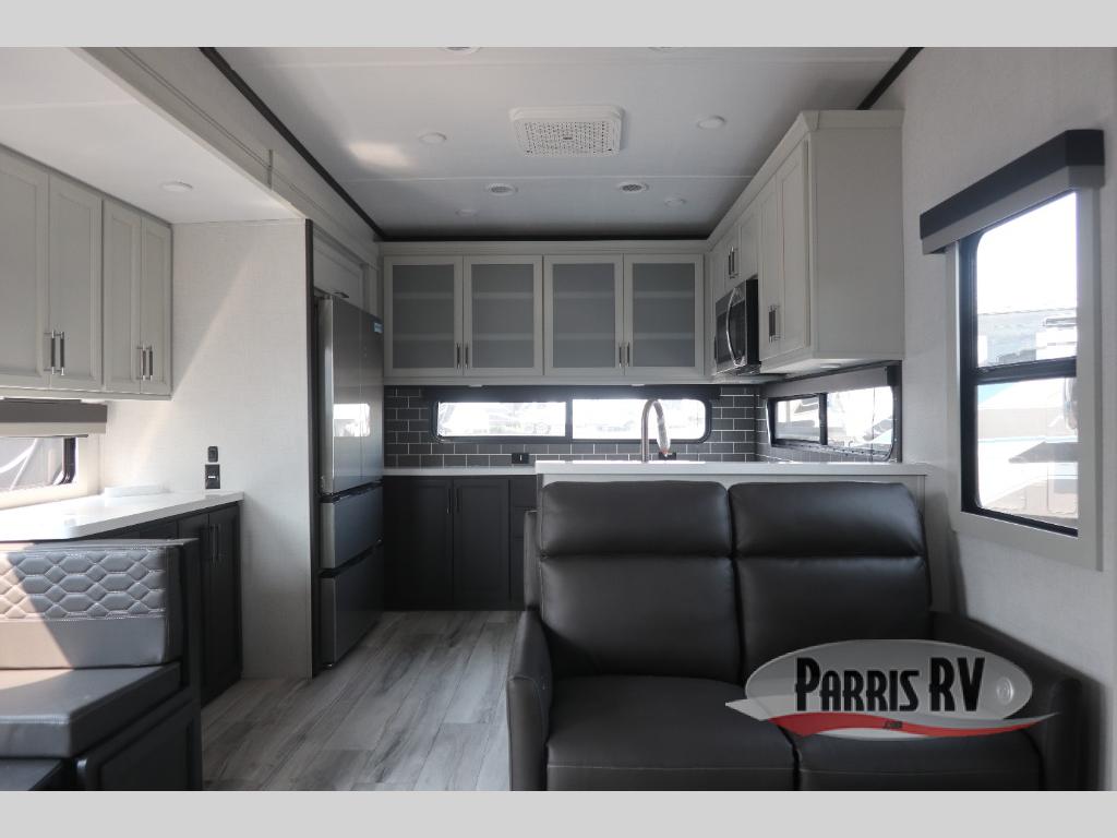The whole gang will love camping in this fifth wheel since there is space for everyone! A front master bedroom includes a king bed slide out, master closet, and stackable washer and dryer prep if you choose to go full-time. Your guests or little ones will love the middle bunkhouse with a flip bunk above a hide-a-bed sofa, along with a pull-out table and storage space. Everyone can meet in the living area which features dual opposing slides for more space, theater seating, a sleeper sofa, and a U-shaped dinette, providing even more sleeping space. And check out the rear kitchen with its wrap-around counter space, Furrion appliances, and large pantry to keep snacks stocked!