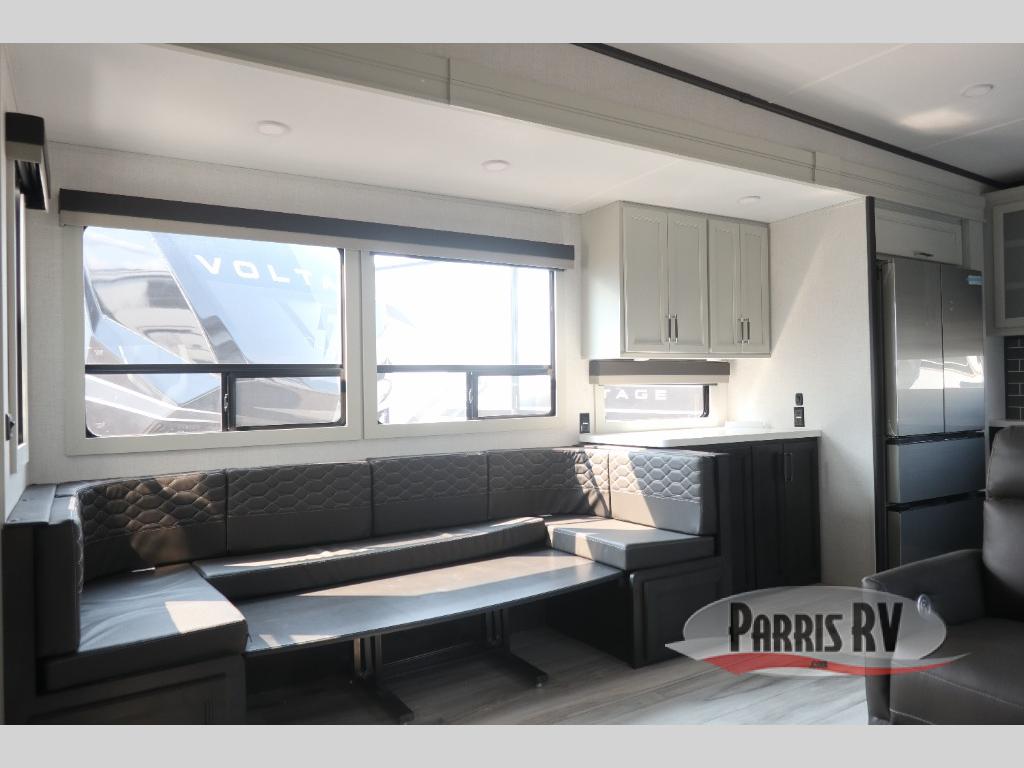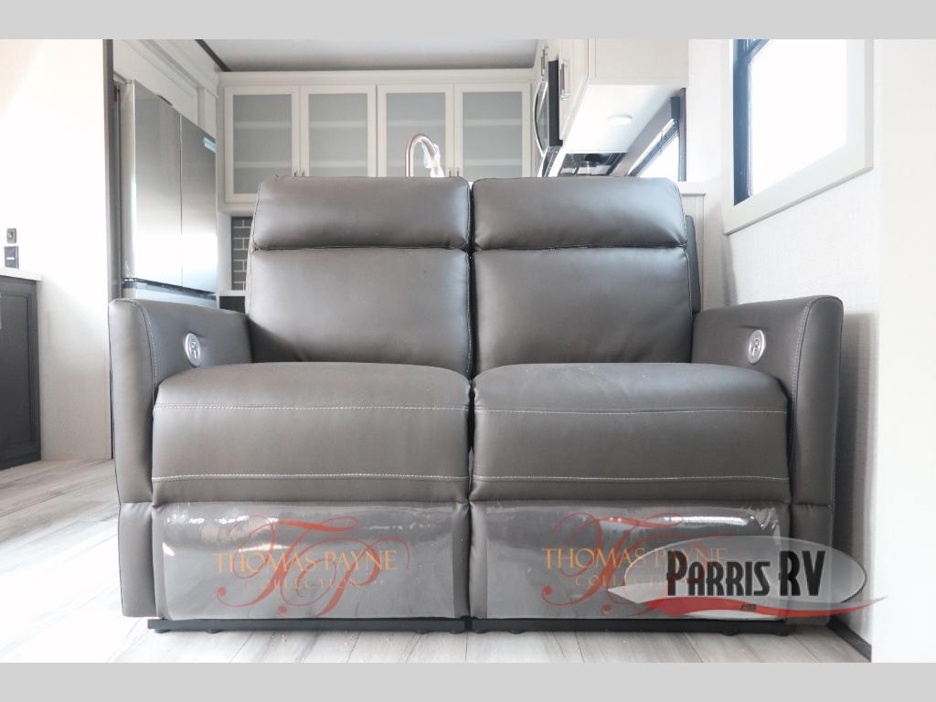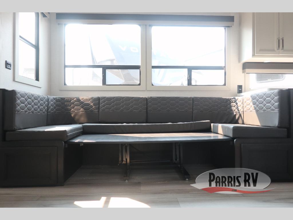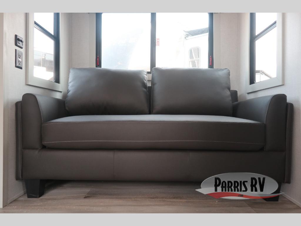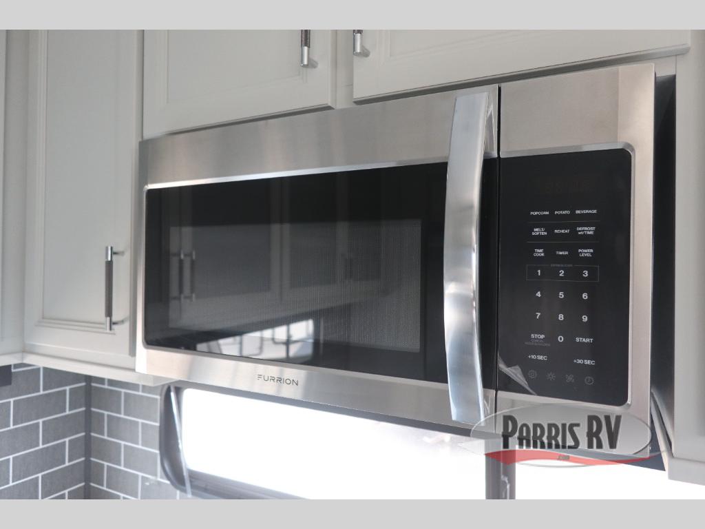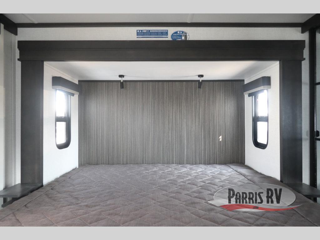 The whole gang will love camping in this fifth wheel since there is space for everyone! A front master bedroom includes a king bed slide out, master closet, and stackable washer and dryer prep if you choose to go full-time. Your guests or little ones will love the middle bunkhouse with a flip bunk above a hide-a-bed sofa, along with a pull-out table and storage space. Everyone can meet in the living area which features dual opposing slides for more space, theater seating, a sleeper sofa, and a U-shaped dinette, providing even more sleeping space. And check out the rear kitchen with its wrap-around counter space, Furrion appliances, and large pantry to keep snacks stocked!