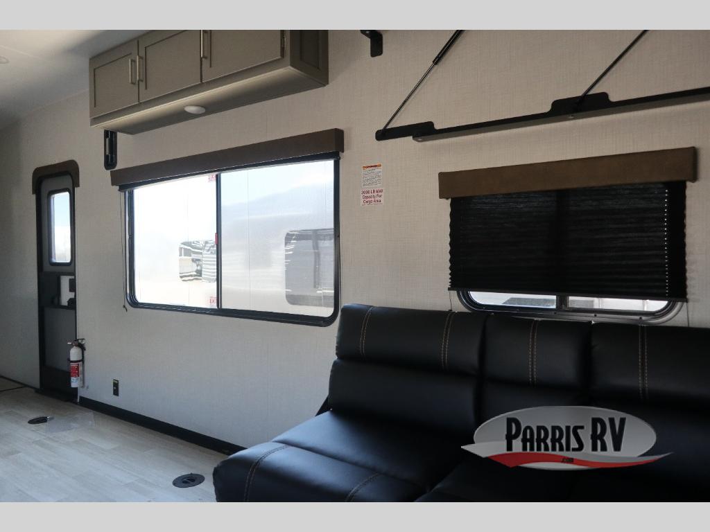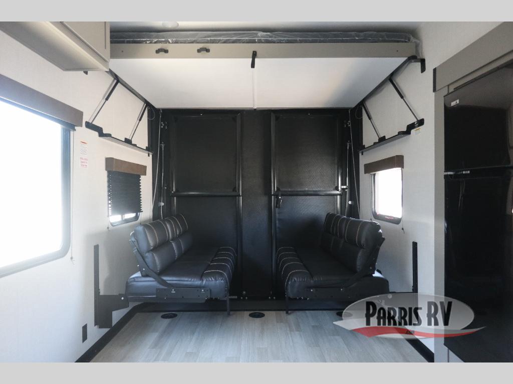 Enjoy a weekend of fun with family and friends with this wide open concept toy hauler featuring 15' of garage space for your toys! This unit sleeps six with the RV queen bed in front and the dual roll over sofas and bonus bunk in back. The 15' garage with 5K inter-lock system tie downs will get all of your cargo safely to your destination. Once in camp, the rear ramp door will help you easily unload and then set up the sofas with table in between. The kitchen slide featuring a hutch allows you to refuel your bodies easily by providing a three burner range and 17" black oven, a 10.7 cu. ft. 12V refrigerator for your perishables, and a residential microwave oven to warm up leftovers. The full bath will allow everyone to easily clean up after a full day of fun, and you will enjoy the private front bedroom with an RV queen bed and a full closet for all of your things. On the outside, an 18' power awning provides added living space, or you might like to add the optional patio packaged for a raised extension of your unit giving you an outdoor space to hang out and enjoy some fresh air between rides.