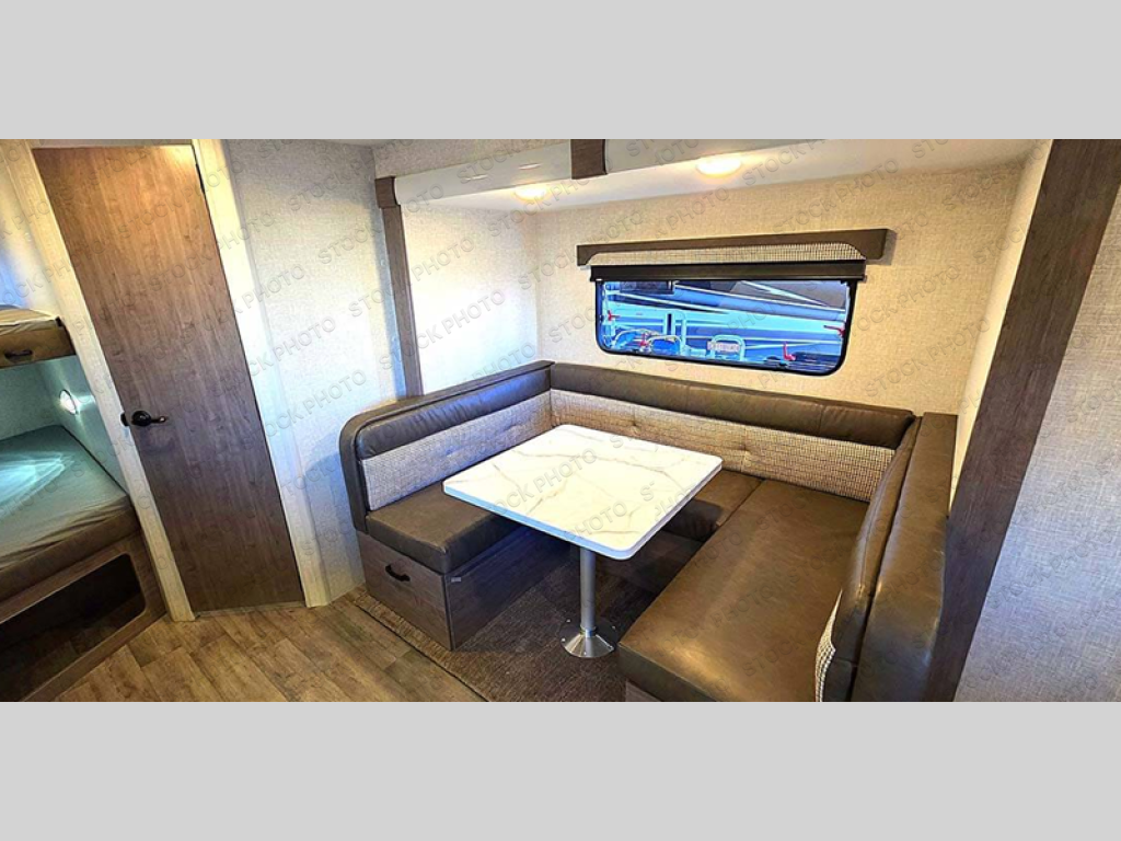 This travel trailer with double-size bunks, a front queen bed, plus a U-shaped dinette can sleep eight happy campers each night! You'll find a flush mount two-burner cooktop with a glass cover and a convection microwave oven to make meals each day, along with a 10.7 cu. ft. Furrion refrigerator to keep food fresh. The rear corner full bath is right next to the bunks for easy nighttime use, and here you'll find a residential radius soft shower door enclosure, a medicine cabinet with a mirror door, plus a dual pane skylight for added head room and natural lighting. Outside, the power awning will provide shade as you visit with campground neighbors, and the pass-through storage with Slam Latch will let you easily grab the fishing poles before heading down to the dock!
