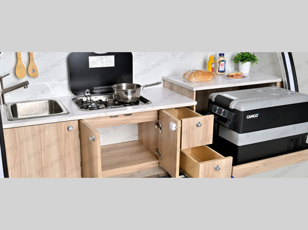 You're going to love camping in this teardrop clamshell trailer! Once you arrive at the campground, you can make lunch on the exterior rear hatch kitchen. There is a two-burner glass-top stove and a 30L 12-volt cooler here to quickly make lunch and grab a cold drink. The interior 5 cu. ft. 12-volt compressor refrigerator will provide more food storage, and an optional microwave can be added inside for the option to heat up quick meals indoors. You're sure to get a great night's rest on the twin-size bed, and the booth dinette can convert to a second twin-size bed so you can sleep two comfortably. The optional Black Canyon Upgrade can be added that includes a solar upgrade to dual 190W panels, holding tank heaters and underglow lights.