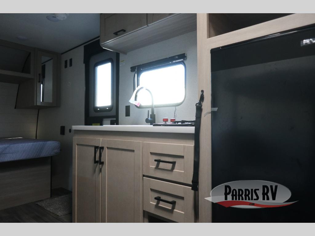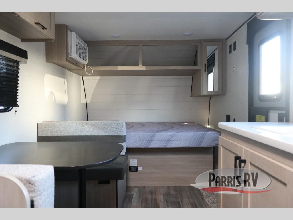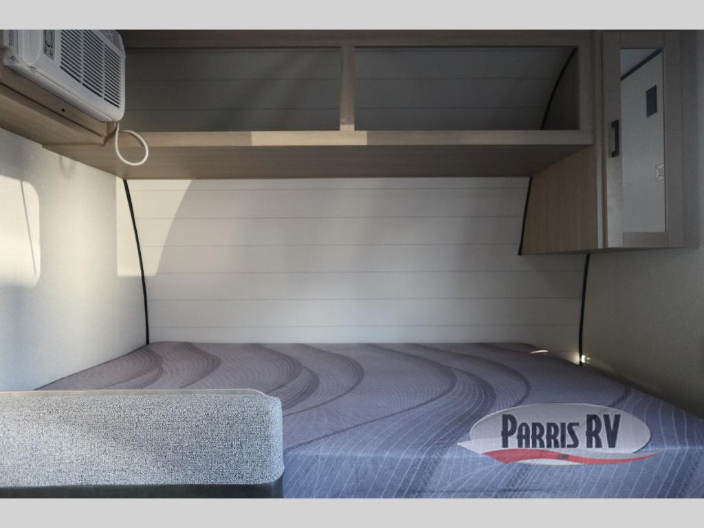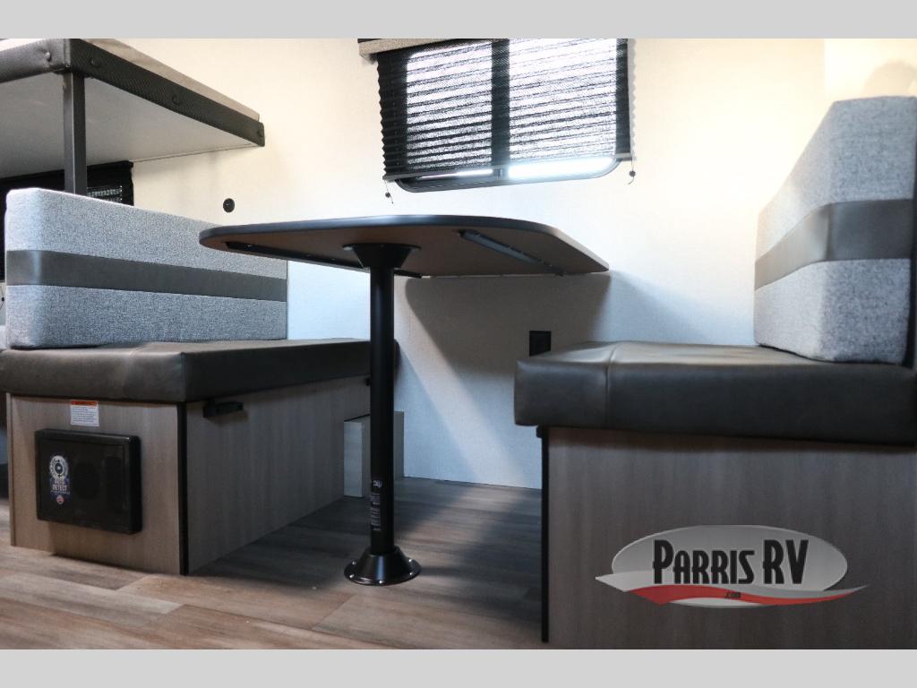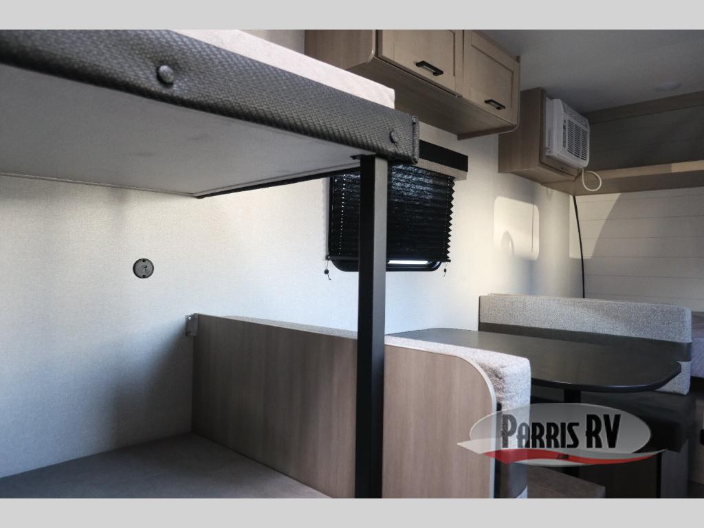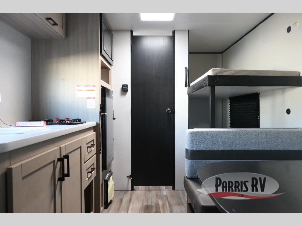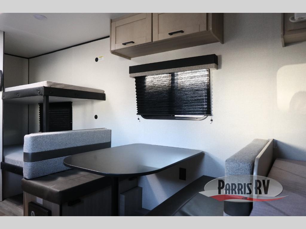 This easy to tow travel trailer features compact sleeping spaces thanks to the bunk beds in the rear corner, and the private bath is right next to the bunks for easy nighttime use! You'll have the front queen bed to yourselves, while another guest or two little ones convert the booth dinette to sleeping space. A two-burner cooktop and microwave oven will let you make meals each day, and there is a 12V refrigerator to keep your cold items fresh. Outside, you'll enjoy the 10' power awning for added shade, and there is exterior storage to keep fishing poles, hiking gear and more!