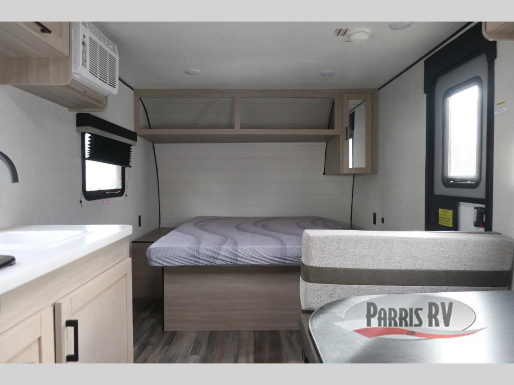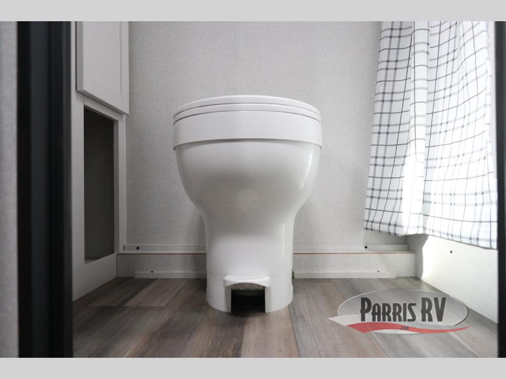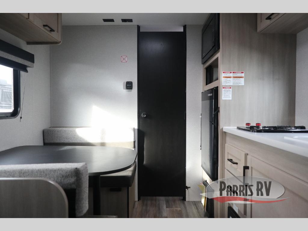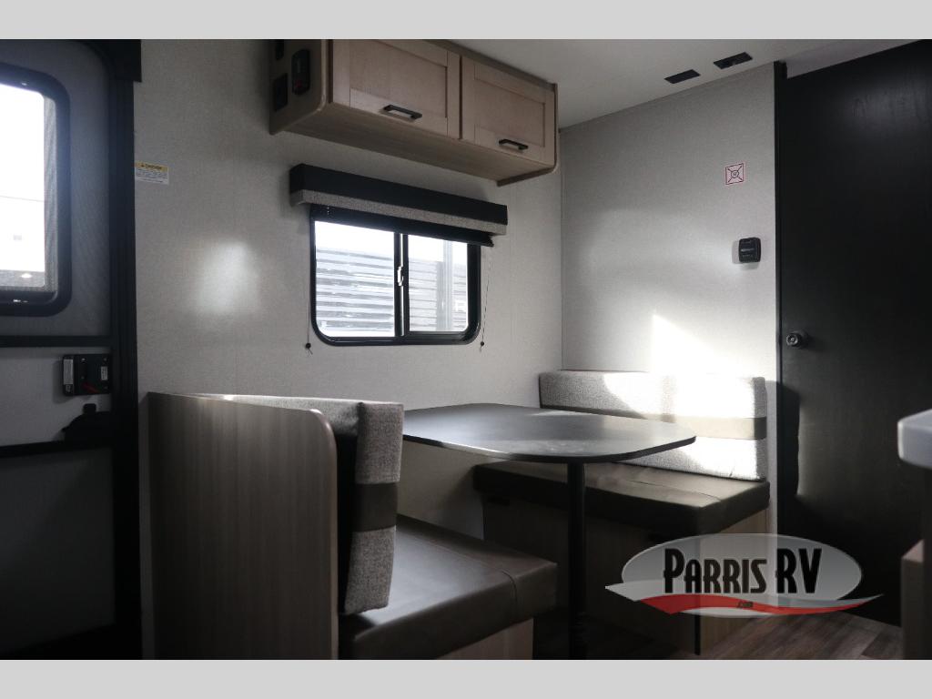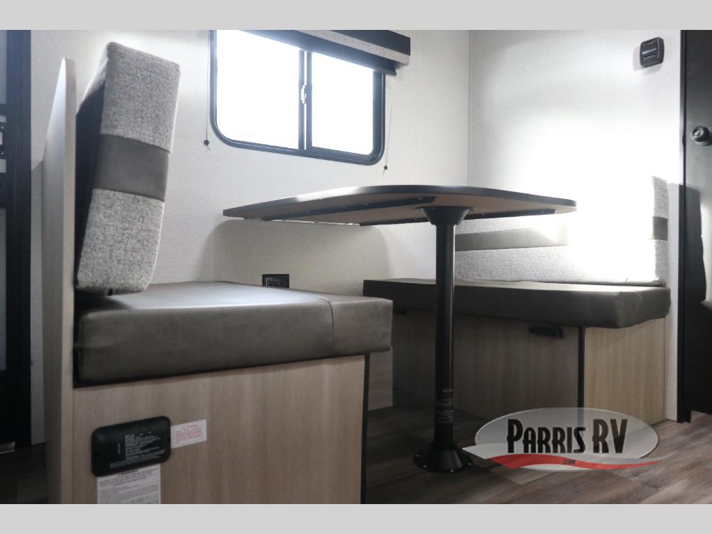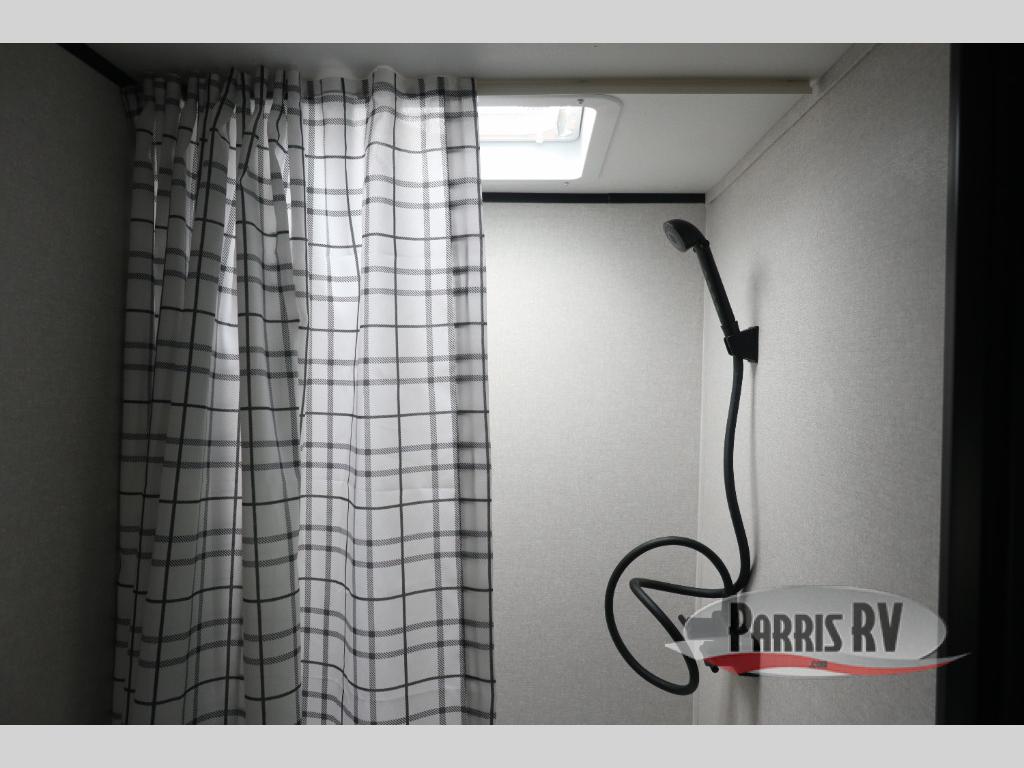This travel trailer is just what the doctor ordered! Once you've loaded up the exterior storage, you can head out to the campground of your choice. The 10' power awning can be put out when you arrive, then you can relax in your camp chairs or head inside to make lunch on the two-burner cooktop. There is also a microwave oven for quick meals and a 12V refrigerator for food storage. A booth dinette provides a place to dine together, and you can convert it to sleeping space at night for one to two guests. You'll love the front queen bed that includes an overhead shelf and a wardrobe for your things, and this unit includes a full rear bath for added privacy. Here, you'll find a 24" x 32" shower, a toilet, and a linen closet plus shelves/storage for toiletries and towels!