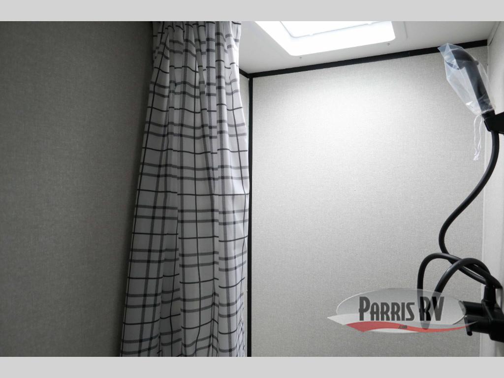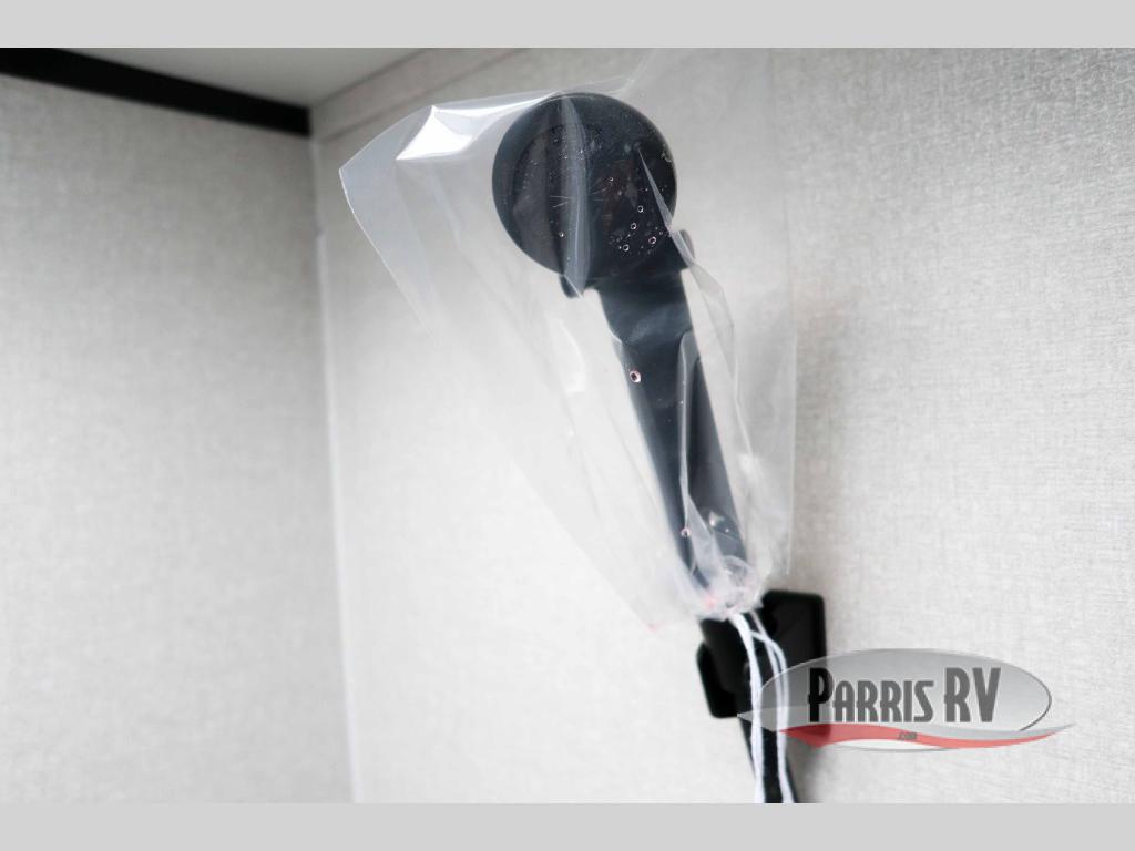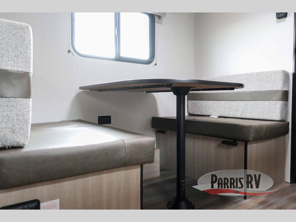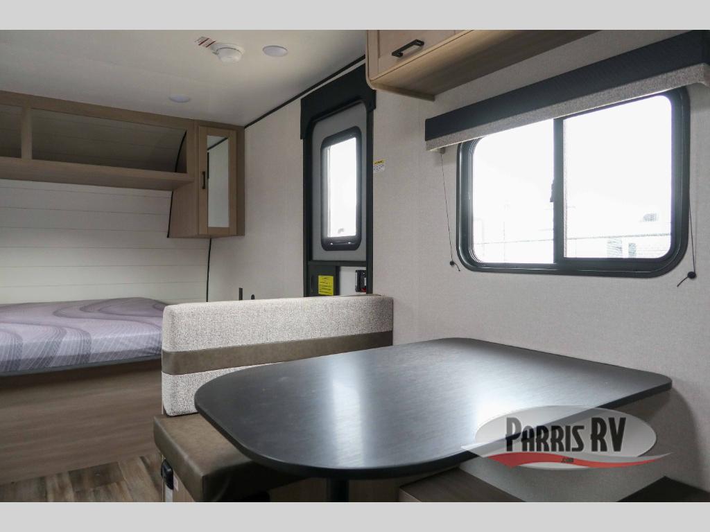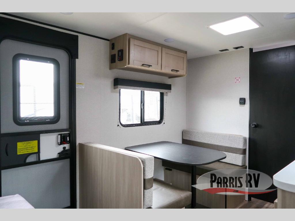 This travel trailer is just what the doctor ordered! Once you've loaded up the exterior storage, you can head out to the campground of your choice. The 10' power awning can be put out when you arrive, then you can relax in your camp chairs or head inside to make lunch on the two-burner cooktop. There is also a microwave oven for quick meals and a 12V refrigerator for food storage. A booth dinette provides a place to dine together, and you can convert it to sleeping space at night for one to two guests. You'll love the front queen bed that includes an overhead shelf and a wardrobe for your things, and this unit includes a full rear bath for added privacy. Here, you'll find a 24" x 32" shower, a toilet, and a linen closet plus shelves/storage for toiletries and towels!