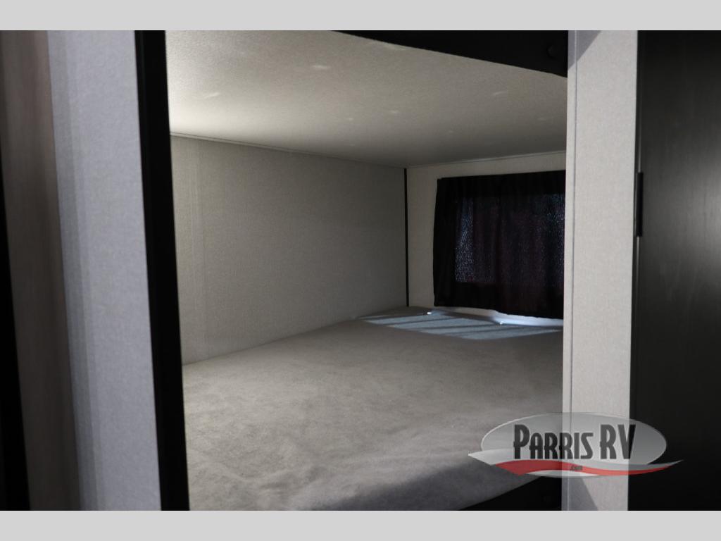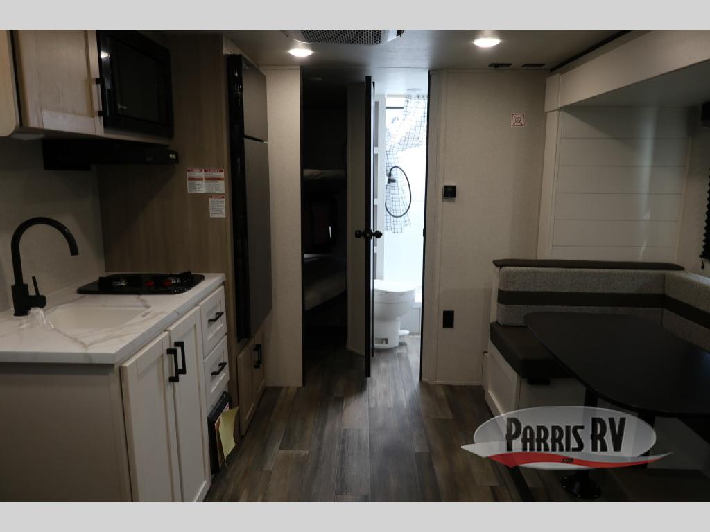 This travel trailer features compact sleeping spaces thanks to the double-size bunk beds in the rear corner, and the private full bath is right next to the bunks for easy nighttime use! You'll have the front Murphy bed all to yourselves, and in the morning, you can fold it away to sit on the jack-knife sofa. A cooktop and microwave oven will let you make meals each day, and there is a 12V refrigerator to keep your cold items fresh. Outside, you'll enjoy the 13' power awning for added shade, and there are two exterior storage compartments to keep fishing poles, hiking gear and more!