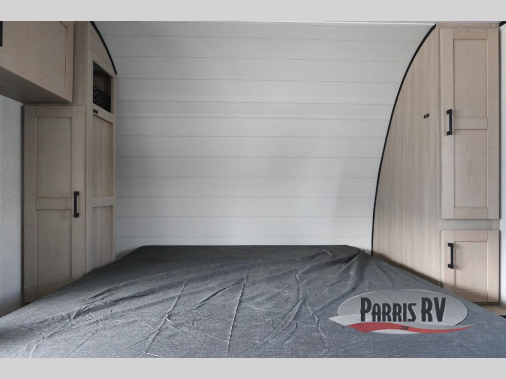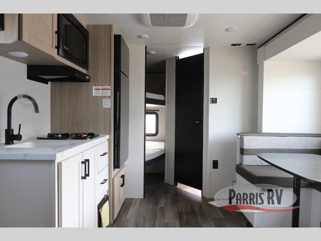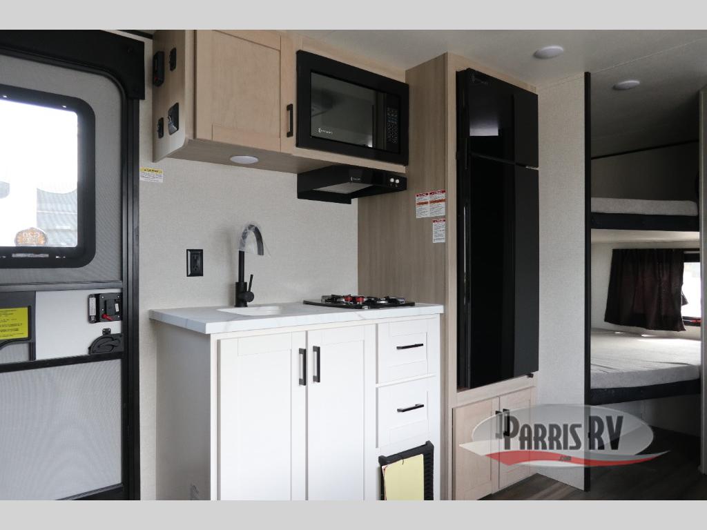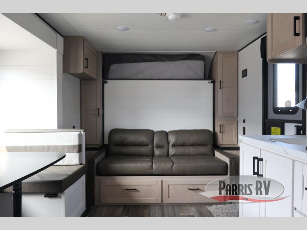 This travel trailer features compact sleeping spaces thanks to the double-size bunk beds in the rear corner, and the private full bath is right next to the bunks for easy nighttime use! You'll have the front Murphy bed all to yourselves, and in the morning, you can fold it away to sit on the jack-knife sofa. A cooktop and microwave oven will let you make meals each day, and there is a 12V refrigerator to keep your cold items fresh. Outside, you'll enjoy the 13' power awning for added shade, and there are two exterior storage compartments to keep fishing poles, hiking gear and more!