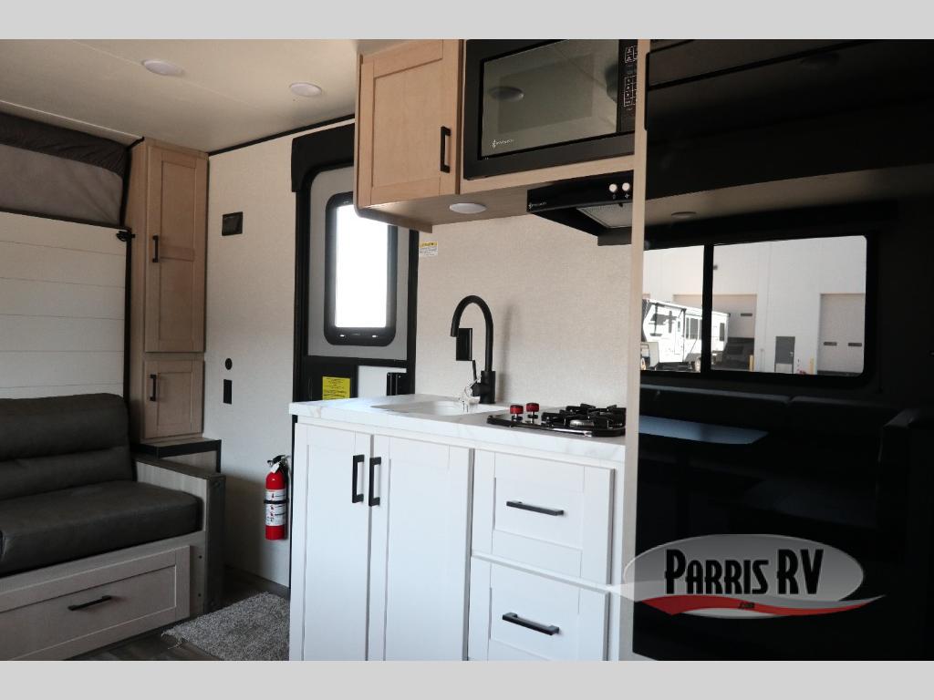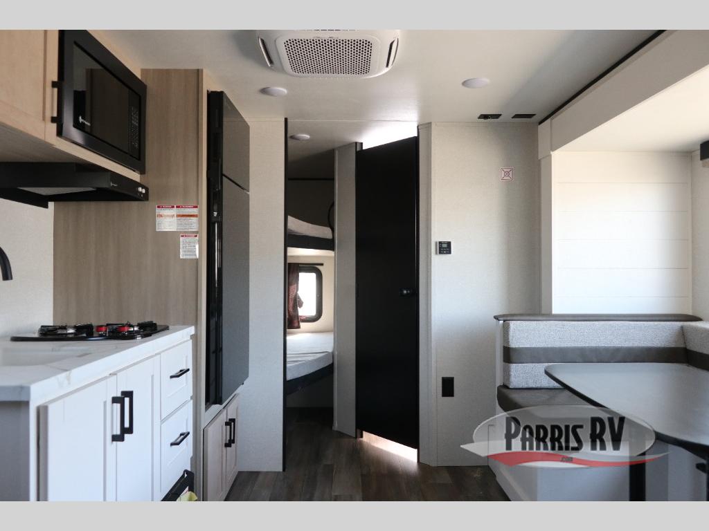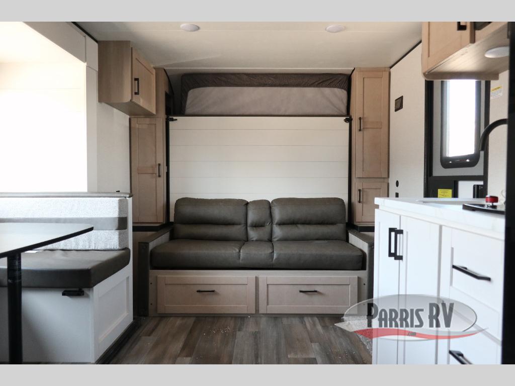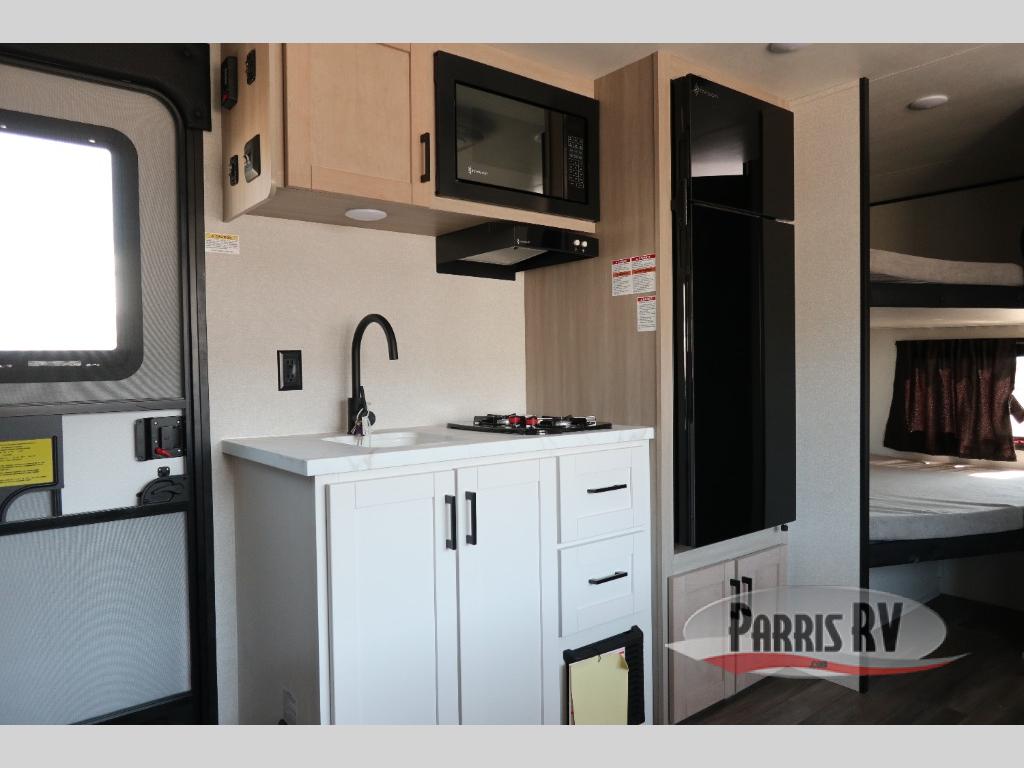 This travel trailer features compact sleeping spaces thanks to the double-size bunk beds in the rear corner, and the private full bath is right next to the bunks for easy nighttime use! You'll have the front Murphy bed all to yourselves, and in the morning, you can fold it away to sit on the jack-knife sofa. A cooktop and microwave oven will let you make meals each day, and there is a 12V refrigerator to keep your cold items fresh. Outside, you'll enjoy the 13' power awning for added shade, and there are two exterior storage compartments to keep fishing poles, hiking gear and more!