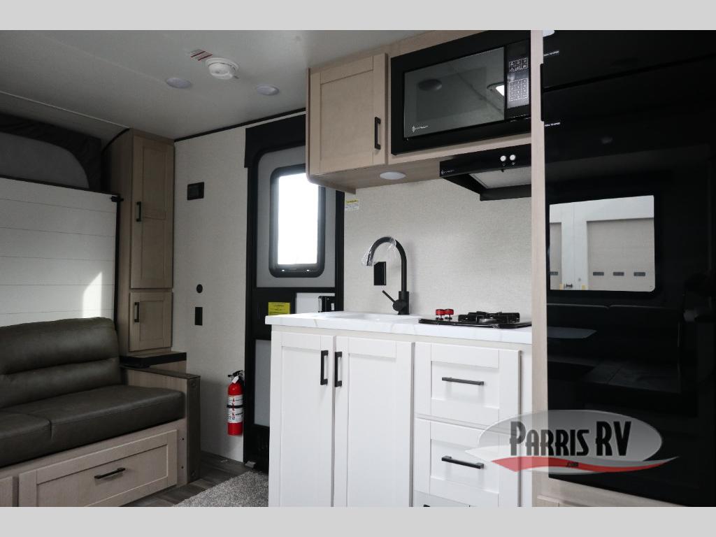 This travel trailer features compact sleeping spaces thanks to the double-size bunk beds in the rear corner, and the private full bath is right next to the bunks for easy nighttime use! You'll have the front Murphy bed all to yourselves, and in the morning, you can fold it away to sit on the jack-knife sofa. A cooktop and microwave oven will let you make meals each day, and there is a 12V refrigerator to keep your cold items fresh. Outside, you'll enjoy the 13' power awning for added shade, and there are two exterior storage compartments to keep fishing poles, hiking gear and more!
