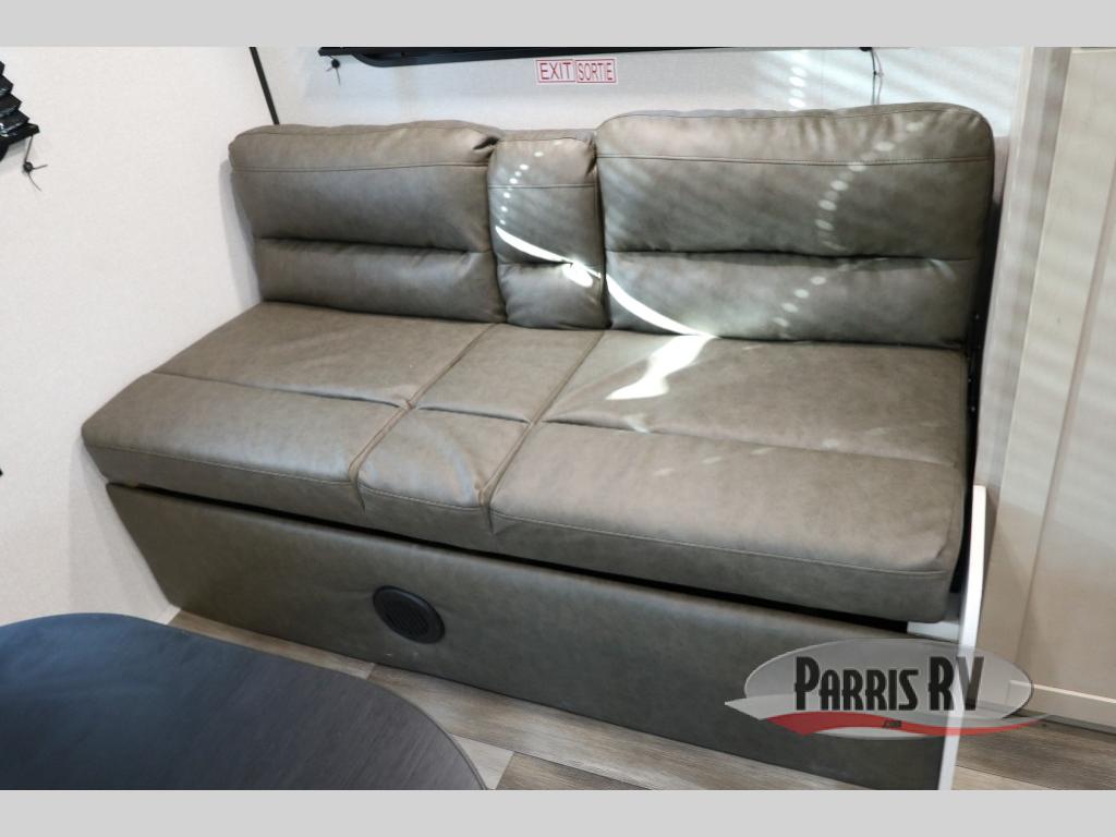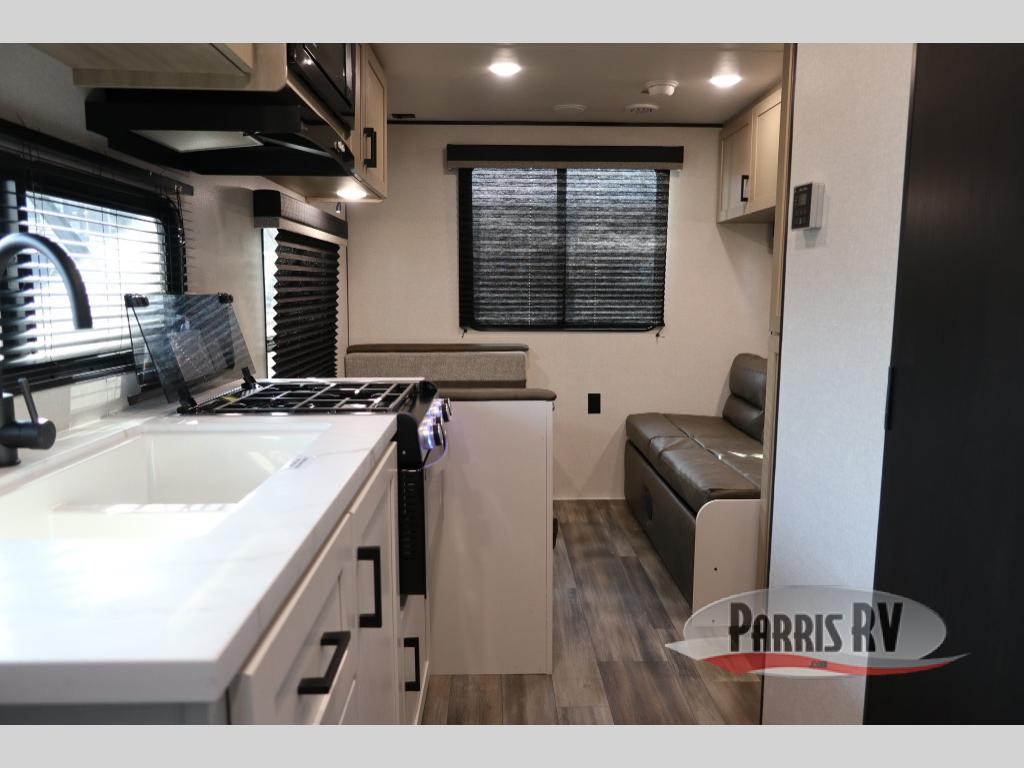 Make each camping trip count in this travel trailer that can sleep four to five each night. You'll wake up feeling refreshed on the front RV queen bed, and there are dual bedside wardrobes to keep your things organized. A middle bath includes a 40" tub/shower, which will make bath time easier if you have little ones. Once breakfast is made on the three-burner cooktop, you can dine at the booth dinette or take your plate outdoors to sit under the 16' power awning with LED lights. This unit also includes a jack-knife sofa, which can be used for sleeping space, along with the dinette!