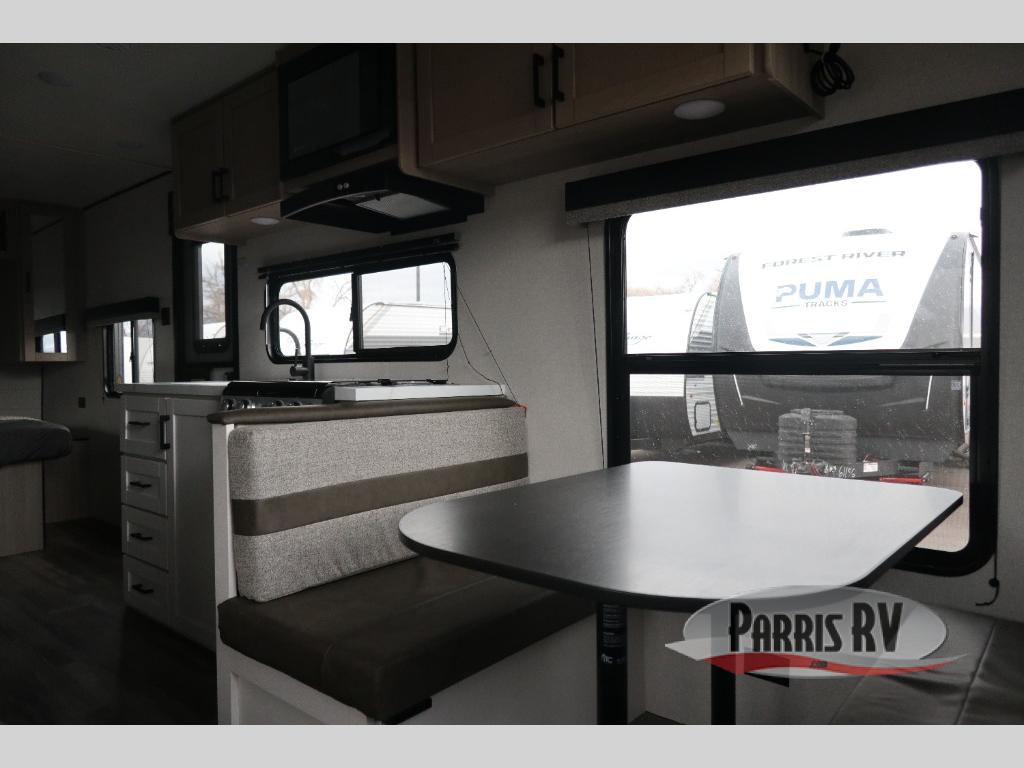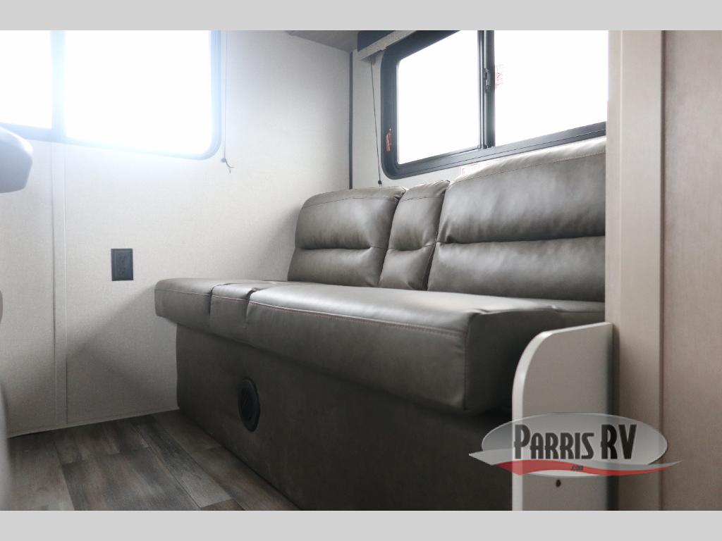 Make each camping trip count in this travel trailer that can sleep four to five each night. You'll wake up feeling refreshed on the front RV queen bed, and there are dual bedside wardrobes to keep your things organized. A middle bath includes a 40" tub/shower, which will make bath time easier if you have little ones. Once breakfast is made on the three-burner cooktop, you can dine at the booth dinette or take your plate outdoors to sit under the 16' power awning with LED lights. This unit also includes a jack-knife sofa, which can be used for sleeping space, along with the dinette!