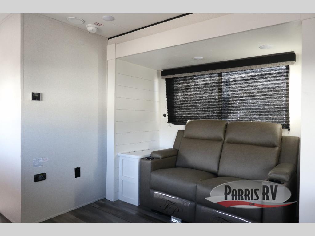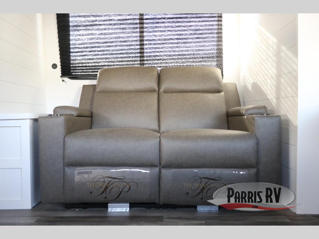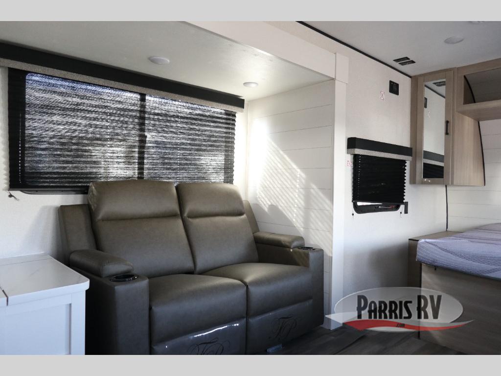 This couple's travel trailer is perfect for weekend trips to the lake! Once you arrive at the campground, you can unload the exterior storage, put out the 17' power awning with LED lights, then relax in your camp chairs. Head inside to make lunch on the three-burner cooktop in the rear corner kitchen, and you'll be pleased to find ample counter space here. The theater seat includes swivel tables where you can dine together, and the front queen bed is sure to bring a great night's rest!