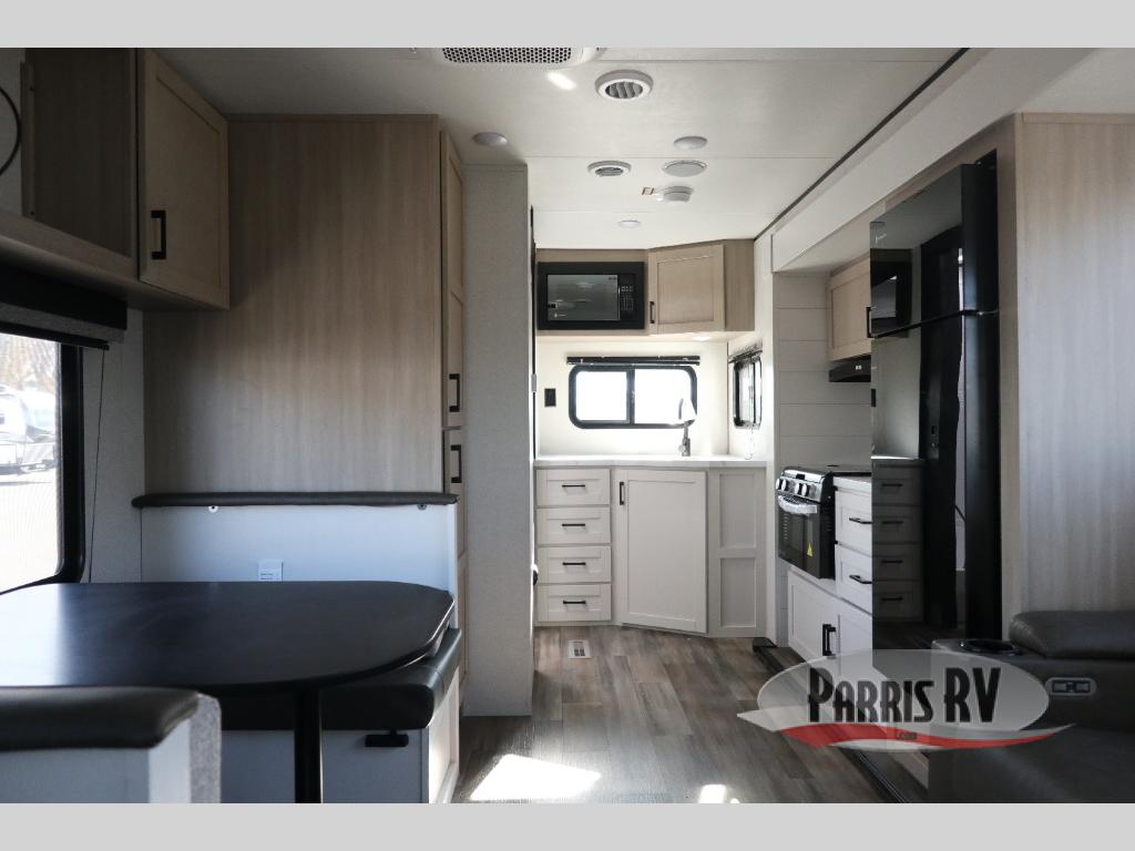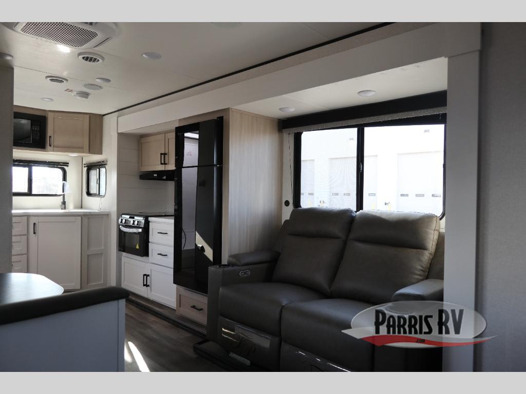 This travel trailer is perfect for weekend trips to the lake! Once you arrive at the campground, you can unload the exterior storage, put out the 18' power awning with LED lights, then relax in your camp chairs. Head inside to make lunch on the three-burner cooktop in the rear corner kitchen, and you'll find the full bath in the other rear corner for quick access. A booth dinette provides a place to dine together, and a theater seat within the large slide out is sure to bring comfort. This unit includes a queen bed in the front semi-private bedroom with a privacy curtain and dual wardrobes for your things!