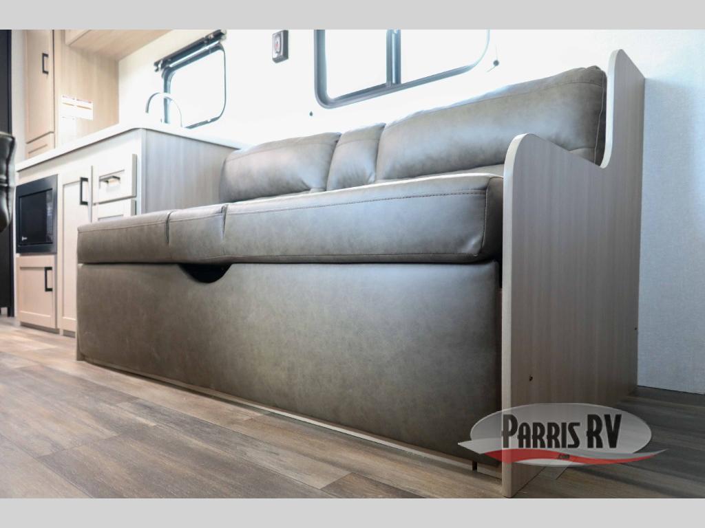 If you enjoy camping with a larger group, this travel trailer is perfect for you! There are double-size bunks in the back, which are right next to the private bath with a toilet and 40" shower. You can take the front queen bed with dual wardrobes, and any other guests can convert the sofa and booth dinette to sleeping space. A two-burner cooktop will let you make breakfast for everyone in the morning, and a 12V refrigerator will keep your perishables fresh!