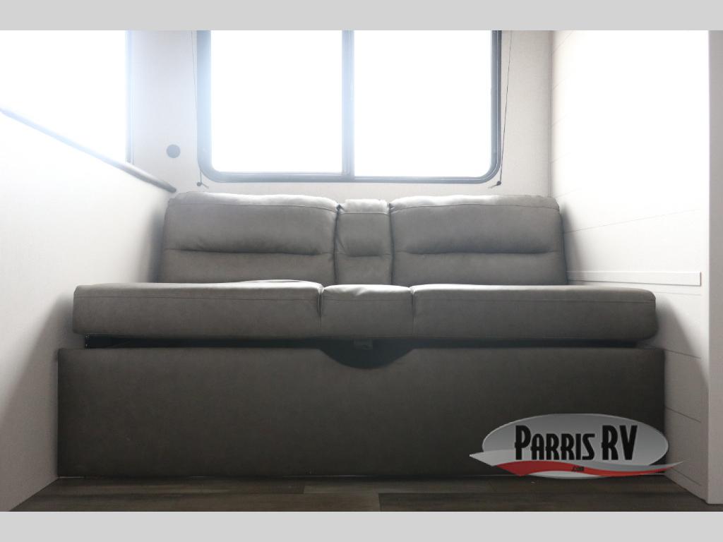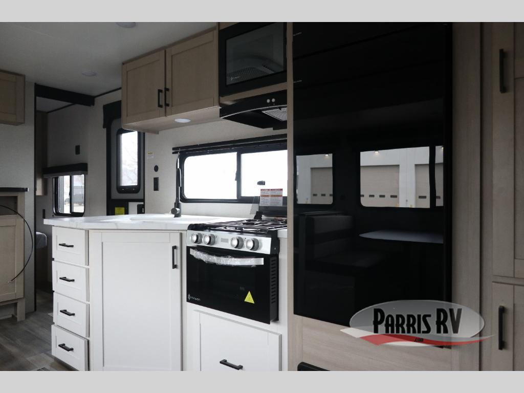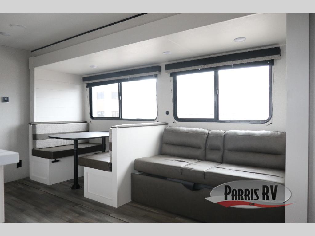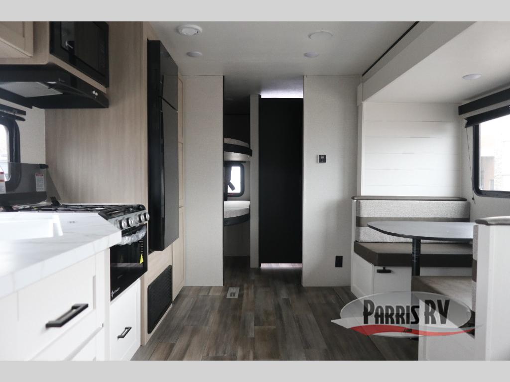 This travel trailer with double-size bunks is spacious and cozy! Once you've unloaded the exterior storage, your crew can put out the 16' power awning with LED lights, then start lunch on the outside kitchen. If the weather isn't cooperating, there is a three-burner cooktop and microwave oven inside, plus comfortable seating on the jack-knife sofa and booth dinette. You're sure to appreciate the front private bedroom with an RV queen bed, dual wardrobes, plus an overhead shelf for books, and the rear corner full bath will let everyone freshen up each day!