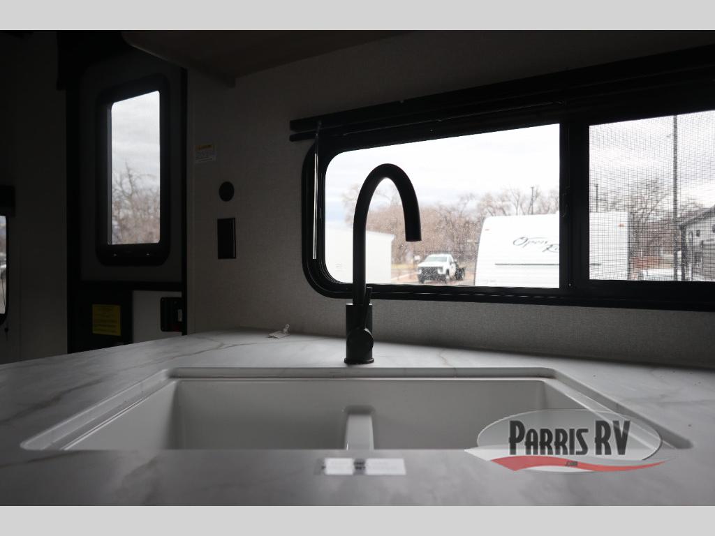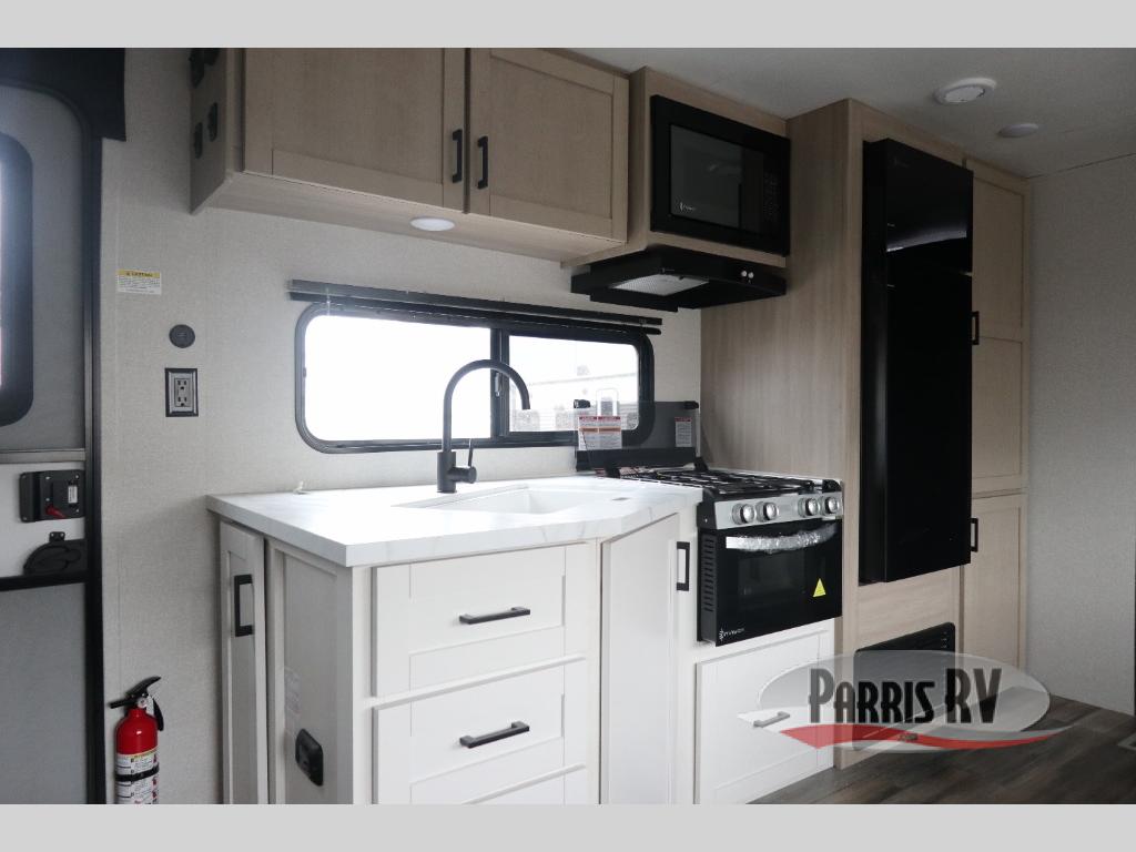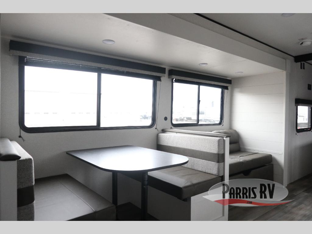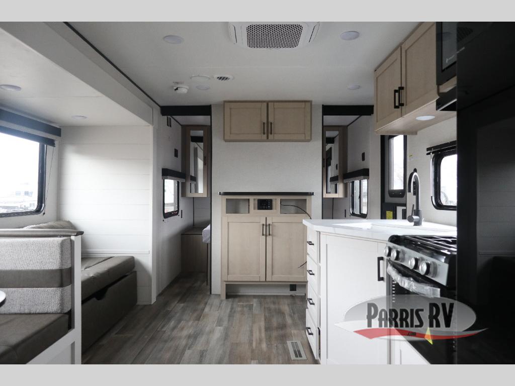 This travel trailer with double-size bunks is spacious and cozy! Once you've unloaded the exterior storage, your crew can put out the 16' power awning with LED lights, then start lunch on the outside kitchen. If the weather isn't cooperating, there is a three-burner cooktop and microwave oven inside, plus comfortable seating on the jack-knife sofa and booth dinette. You're sure to appreciate the front private bedroom with an RV queen bed, dual wardrobes, plus an overhead shelf for books, and the rear corner full bath will let everyone freshen up each day!