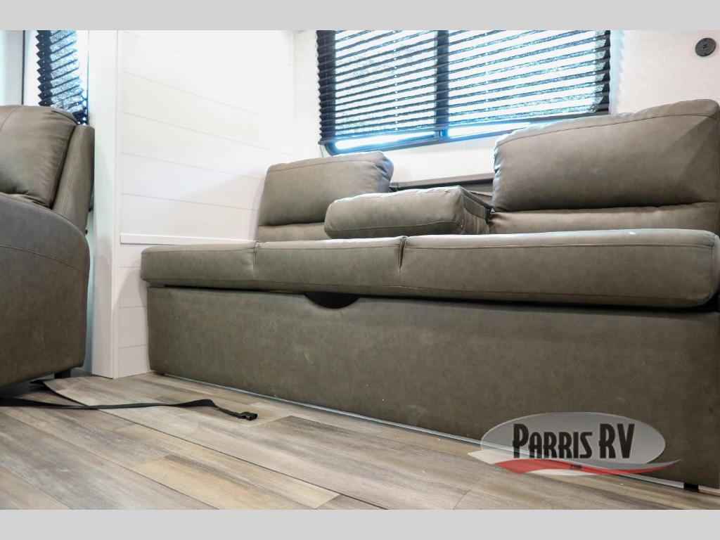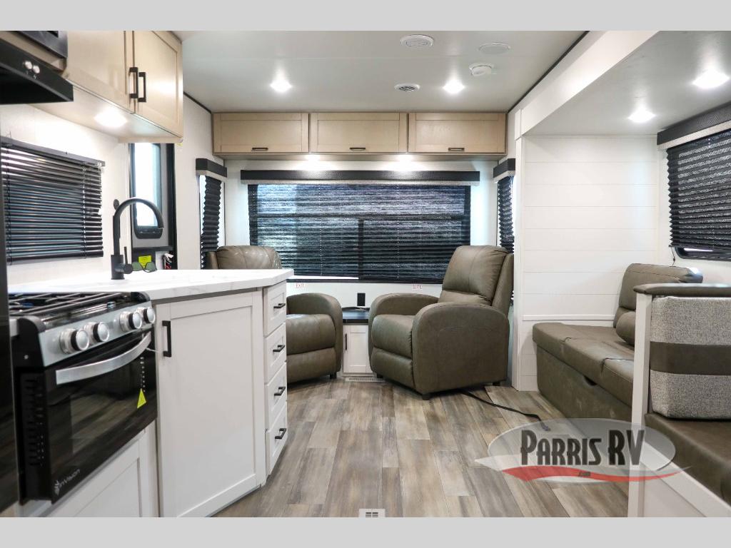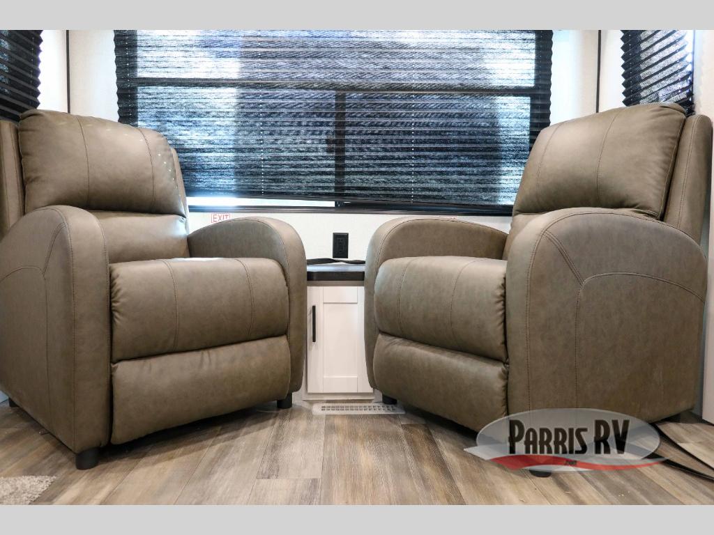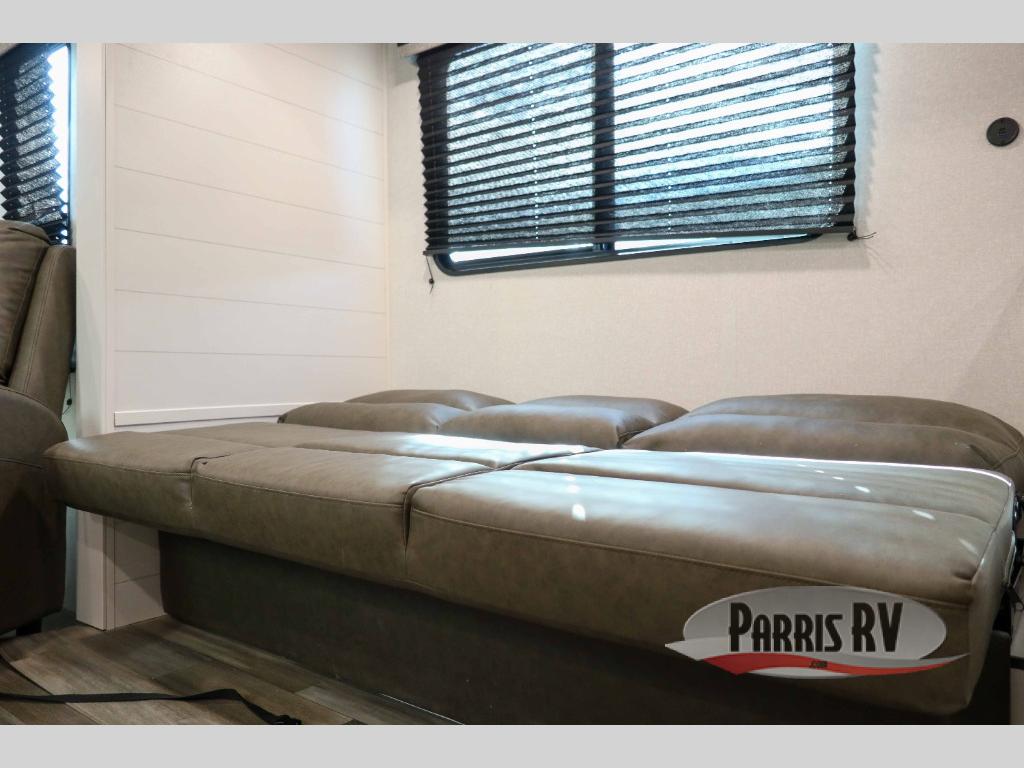With dual entry doors in this unit, you can enter in through the front master bedroom or the rear living room! The dual lounge chairs in the back will let you relax with a book and your coffee, and there is a large slide out with a jack-knife sofa and booth dinette for additional seating spaces. The chef of your group can make meals on the three-burner cooktop or in the microwave oven, and there is a pantry for dry goods or snacks. The walk-thru bath is easily accessible for everyone to use, and the front master bedroom with a 60" x 74" RV queen bed will make you feel right at home!