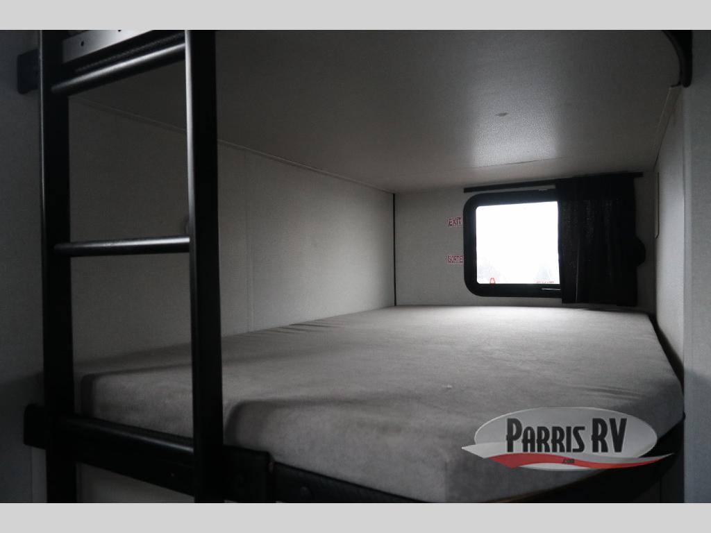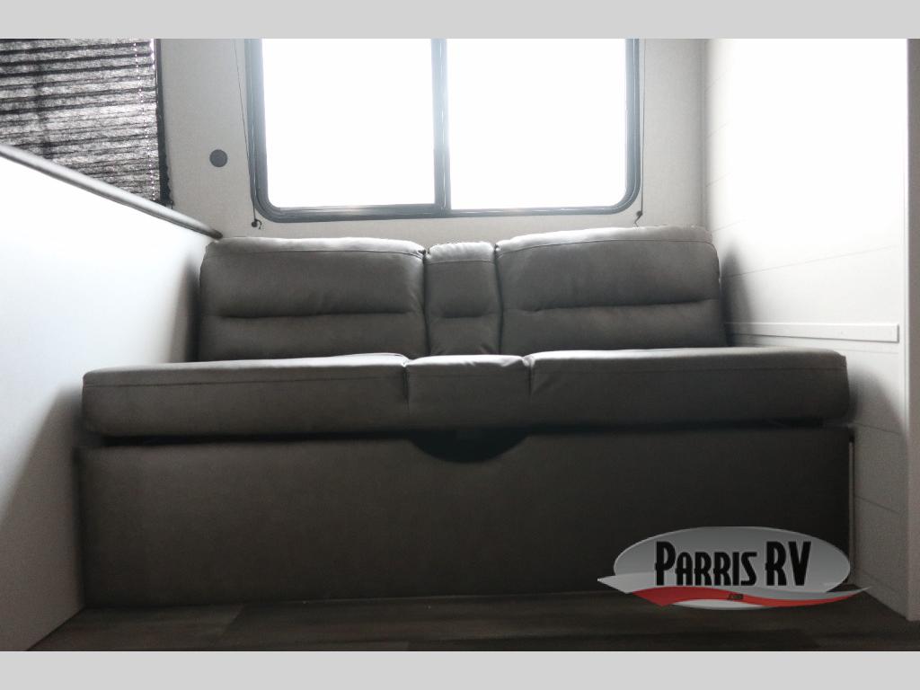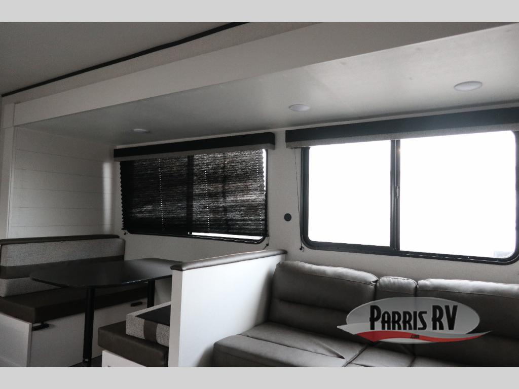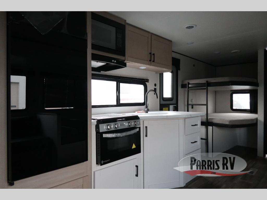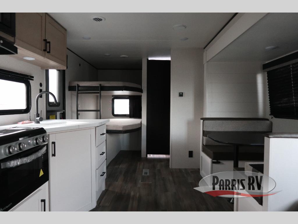 This travel trailer with double-size bunks is spacious and cozy! Once you've unloaded the exterior storage, your crew can put out the 20' power awning with LED lights, then start lunch on the outside kitchen. If the weather isn't cooperating, there is a three-burner cooktop and microwave oven inside, plus comfortable seating on the jack-knife sofa and booth dinette. You're sure to appreciate the front private bedroom with an RV queen bed, dual wardrobes, an overhead shelf, plus a bedroom closet for more shoes and clothes!