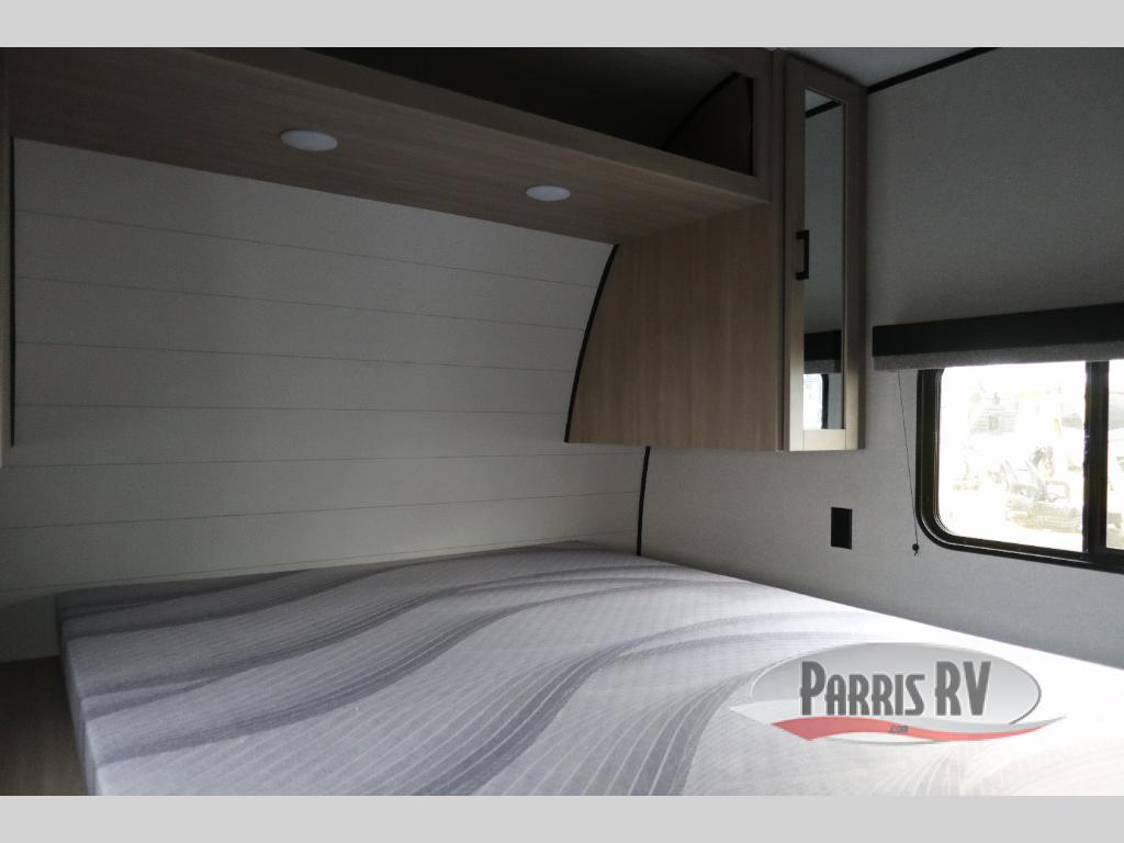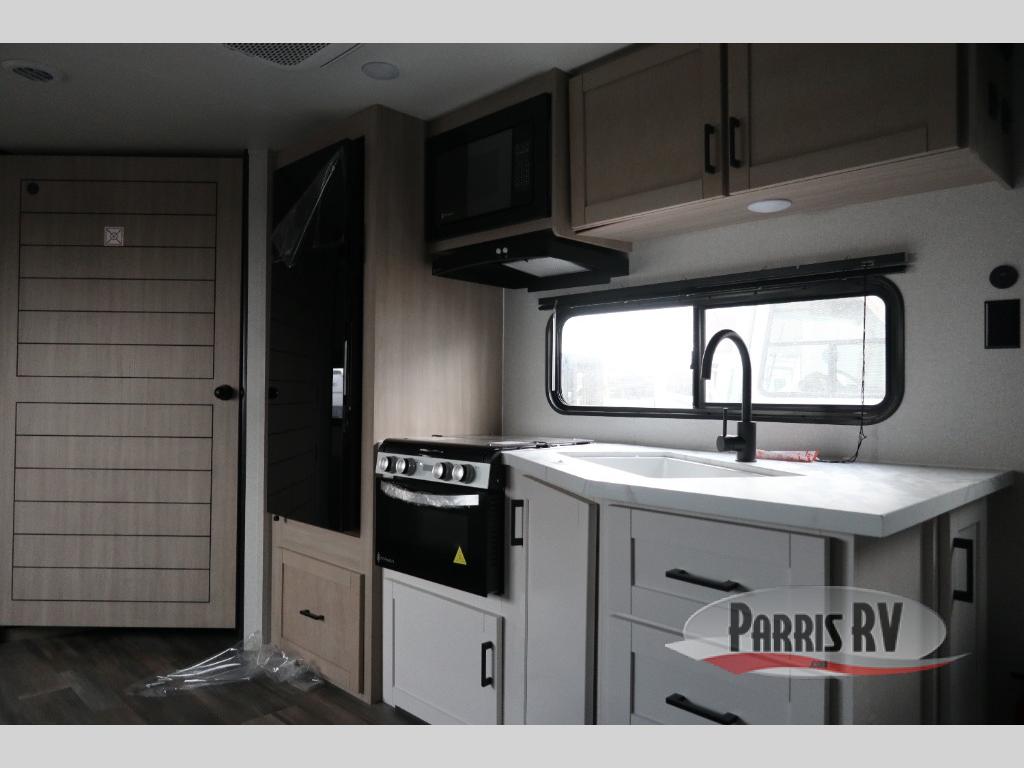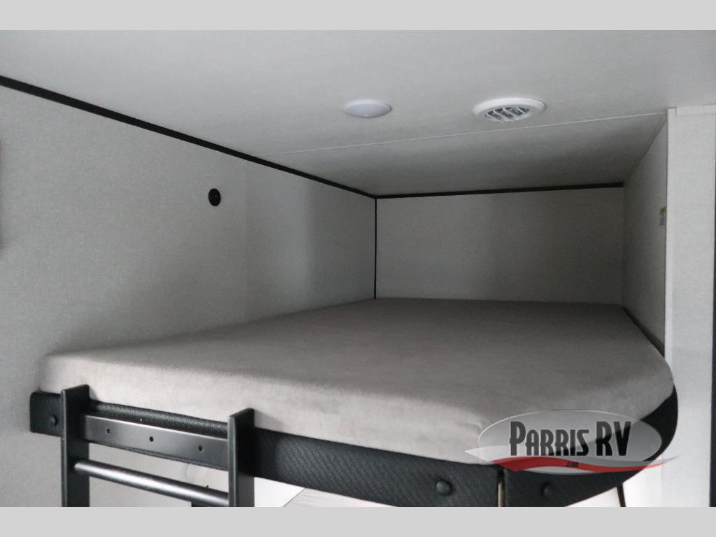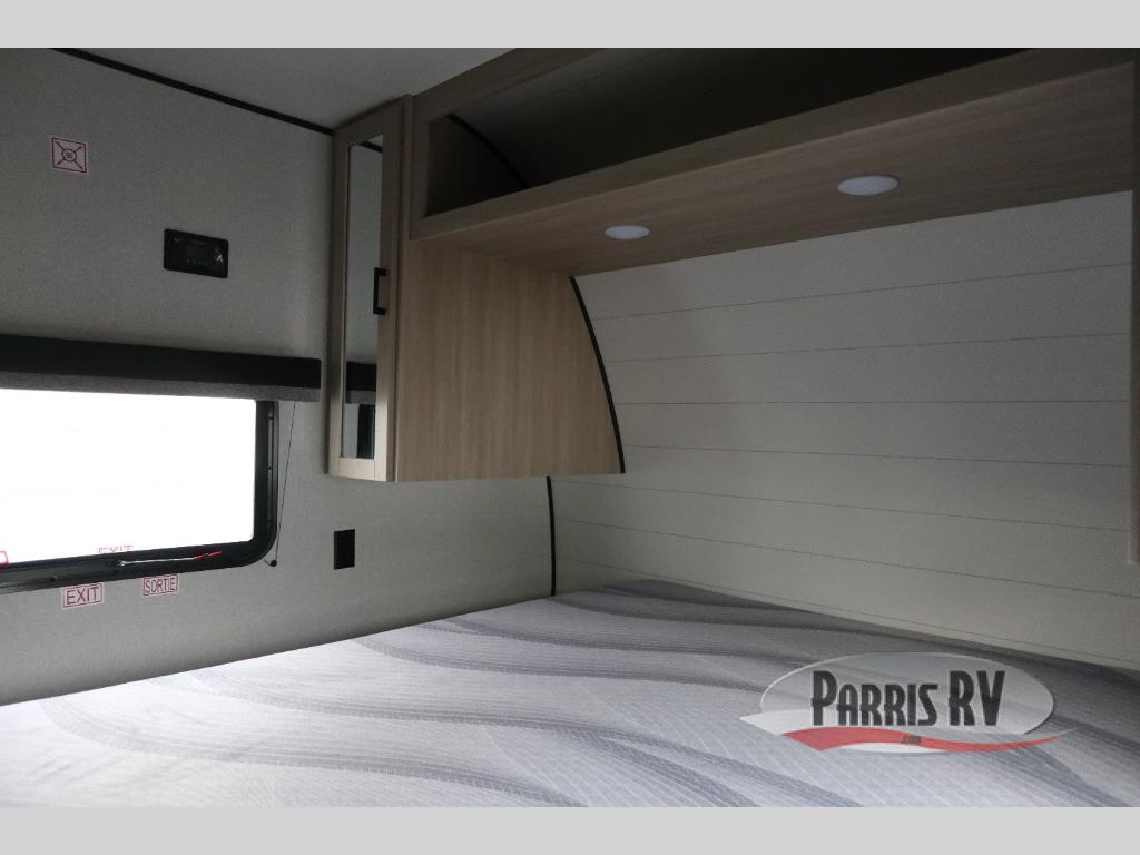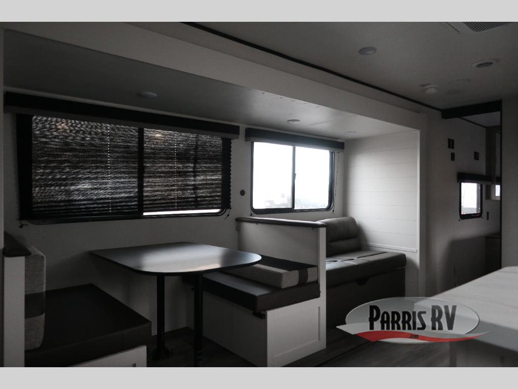 This travel trailer with double-size bunks is spacious and cozy! Once you've unloaded the exterior storage, your crew can put out the 20' power awning with LED lights, then start lunch on the outside kitchen. If the weather isn't cooperating, there is a three-burner cooktop and microwave oven inside, plus comfortable seating on the jack-knife sofa and booth dinette. You're sure to appreciate the front private bedroom with an RV queen bed, dual wardrobes, an overhead shelf, plus a bedroom closet for more shoes and clothes!