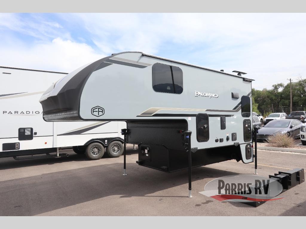 Each Backpack Edition truck camper by Palomino is constructed with high-density block foam insulation, an alpha super flex membrane roof, and Azdel substrate for added durability. You will also love the white or grey hi-gloss exterior fiberglass that is eye-catching and easy to keep clean. Inside, you'll find solid surface countertops, white cabinets, an undermount sink, and more comforts. The 200-watts of solar power and 100 Amp lithium battery will keep you powered up, and the electric jacks will have you set up at camp in no-time!