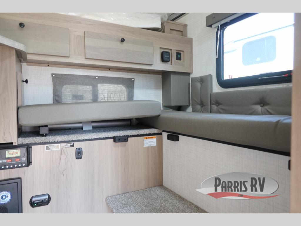 Make the most of all your adventures with this soft side truck camper! Start each morning feeling recharged after sleeping on the front queen bed with foot lockers and bedroom storage on either side of it, and freshen up in the wet bath with storage to keep your towel nearby. There is storage across from the bathroom for your canned goods, a refrigerator to keep your perishables fresh, and a two burner cooktop to prepare your best meals. Enjoy your meals at the seating area with a table then grab a board game from the storage area under the seating!