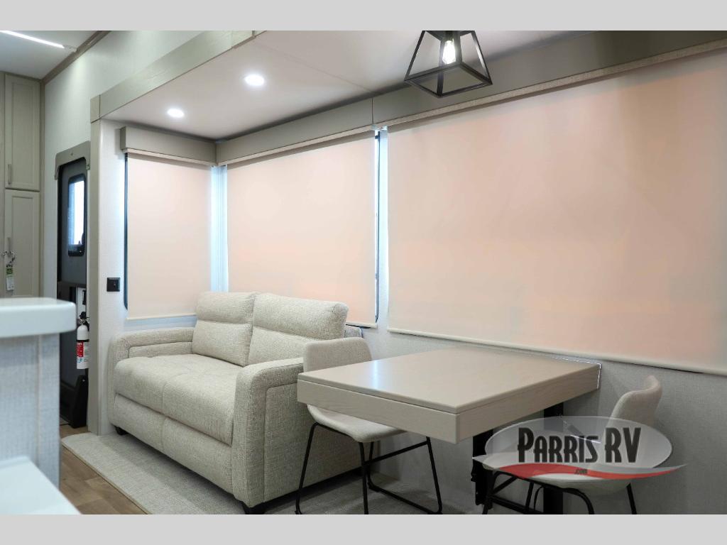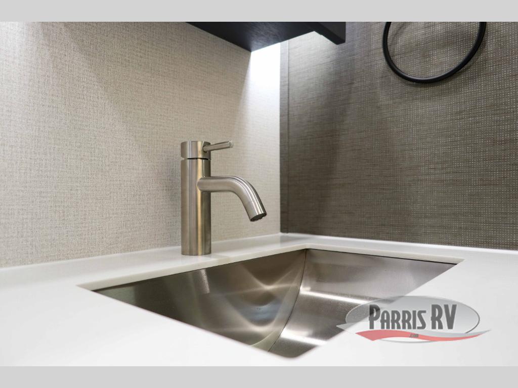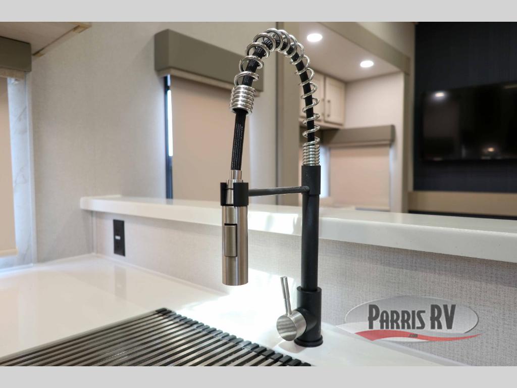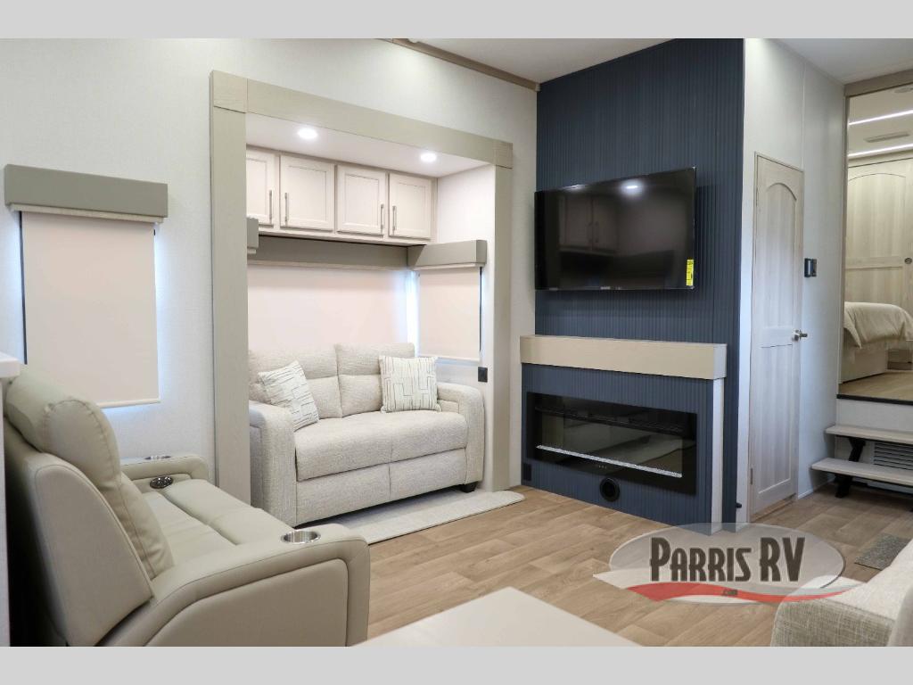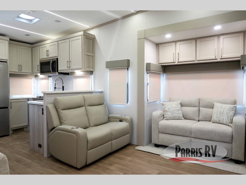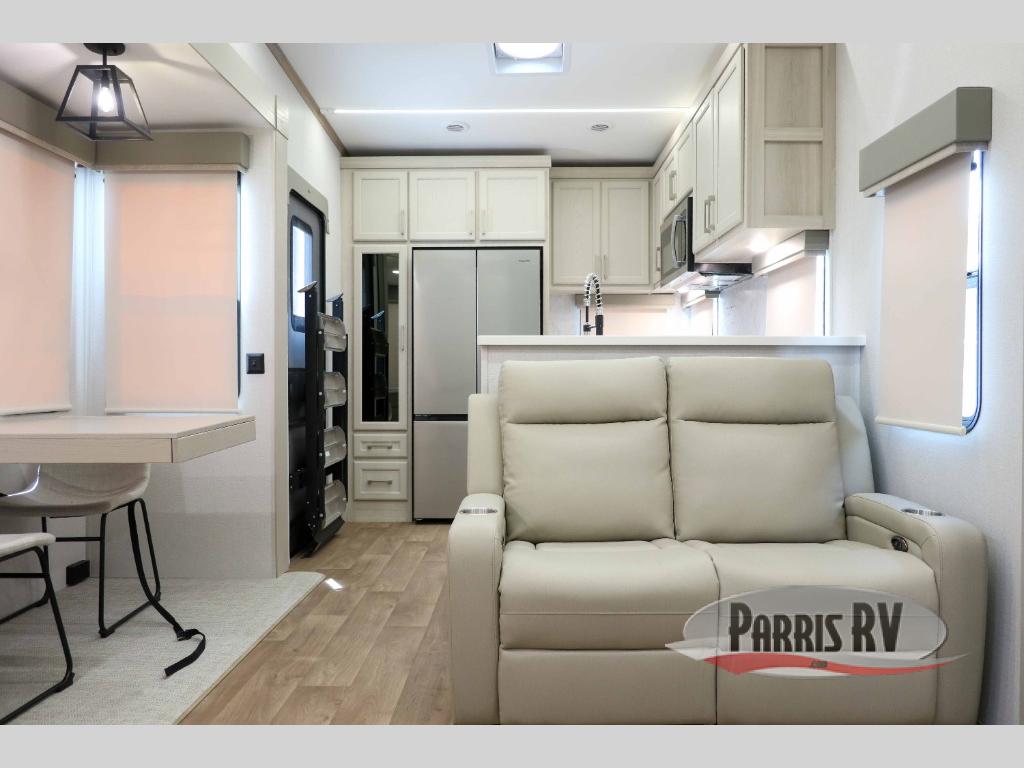You won't believe all that this fifth wheel has to offer! Starting with the rear kitchen which has plenty of countertop space to prepare your delicious meals, a four burner cooktop with a stainless steel 24" oven to cook them, and a large single bowl stainless steel sink for easy clean up. The living area has opposing sofas and a theater seat with USB charging and storage across from an entertainment center with 50" Smart TV. The half bathroom is close to the living area so you can get back to watching your movie faster. You will feel right at home sleeping in the master suite on a slide out king bed across from a dresser and hamper to keep your space tidy, plus entrance into the front full bathroom. Inside the bathroom, you will find a vanity with dual sinks for two to get ready at once, a spacious shower with a seat, and a walk-in closet for clothes, shoes, and more!