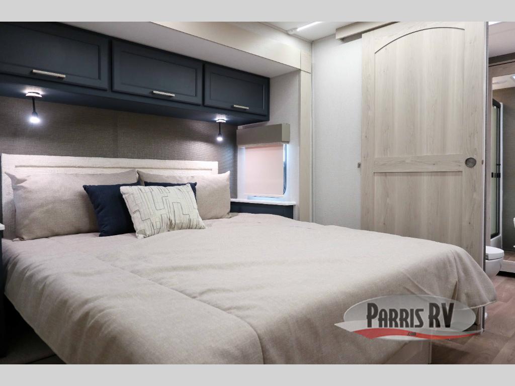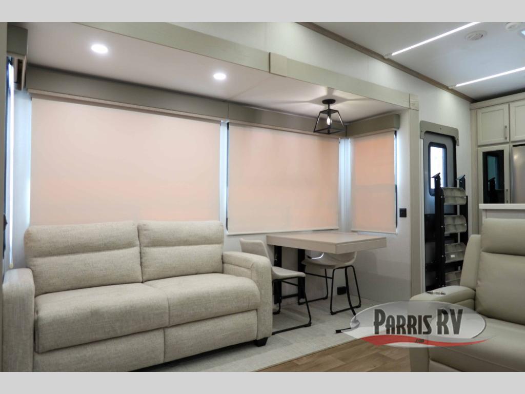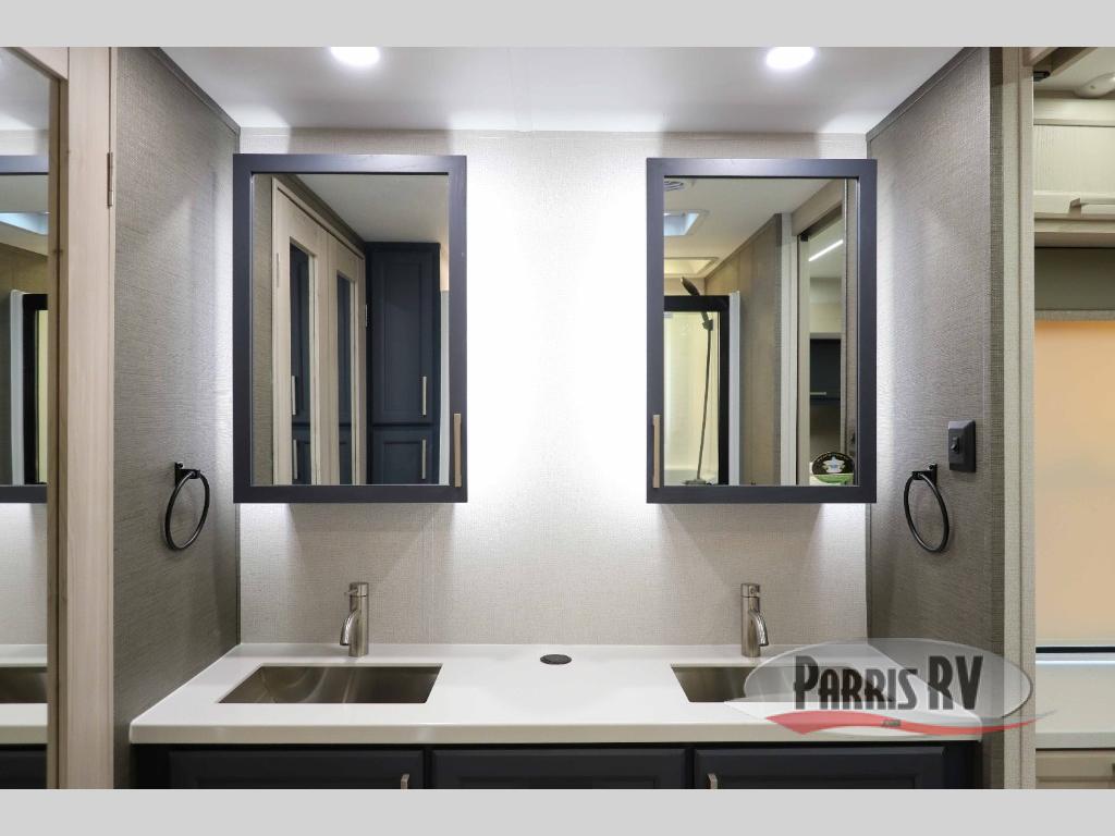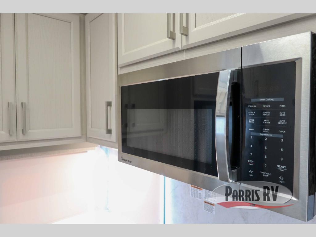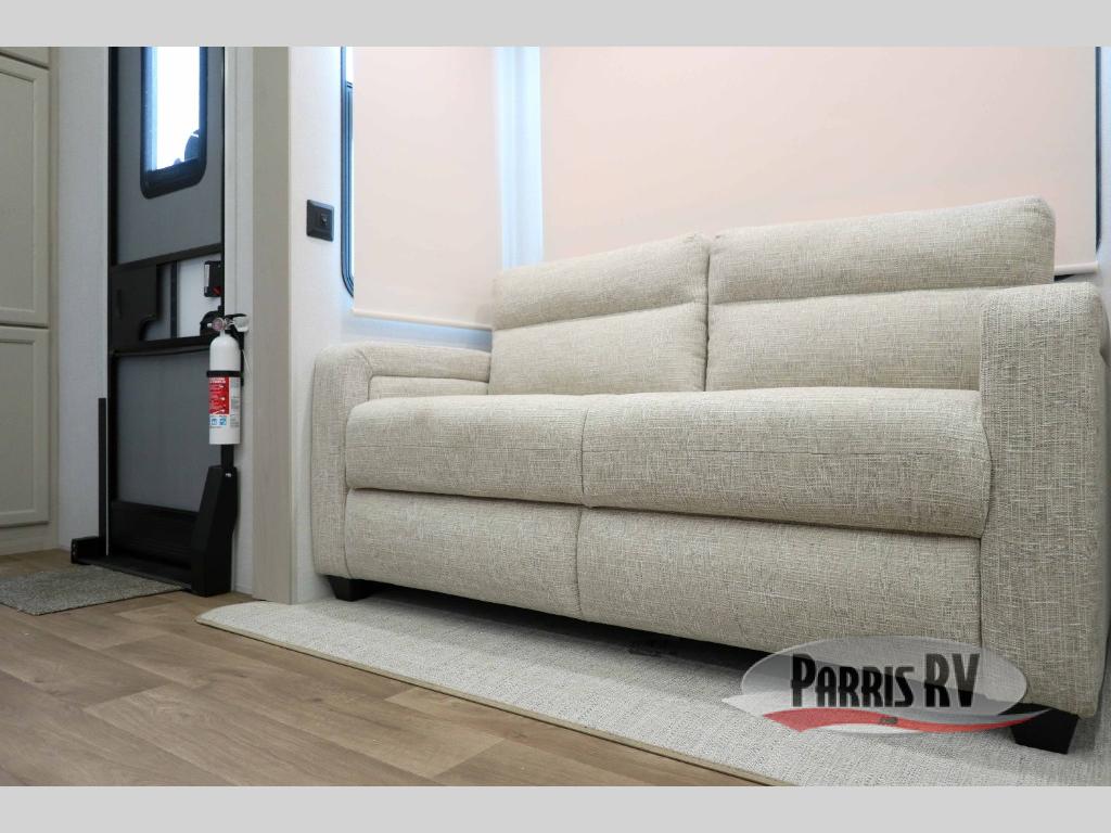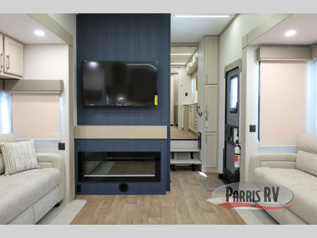 You won't believe all that this fifth wheel has to offer! Starting with the rear kitchen which has plenty of countertop space to prepare your delicious meals, a four burner cooktop with a stainless steel 24" oven to cook them, and a large single bowl stainless steel sink for easy clean up. The living area has opposing sofas and a theater seat with USB charging and storage across from an entertainment center with 50" Smart TV. The half bathroom is close to the living area so you can get back to watching your movie faster. You will feel right at home sleeping in the master suite on a slide out king bed across from a dresser and hamper to keep your space tidy, plus entrance into the front full bathroom. Inside the bathroom, you will find a vanity with dual sinks for two to get ready at once, a spacious shower with a seat, and a walk-in closet for clothes, shoes, and more!