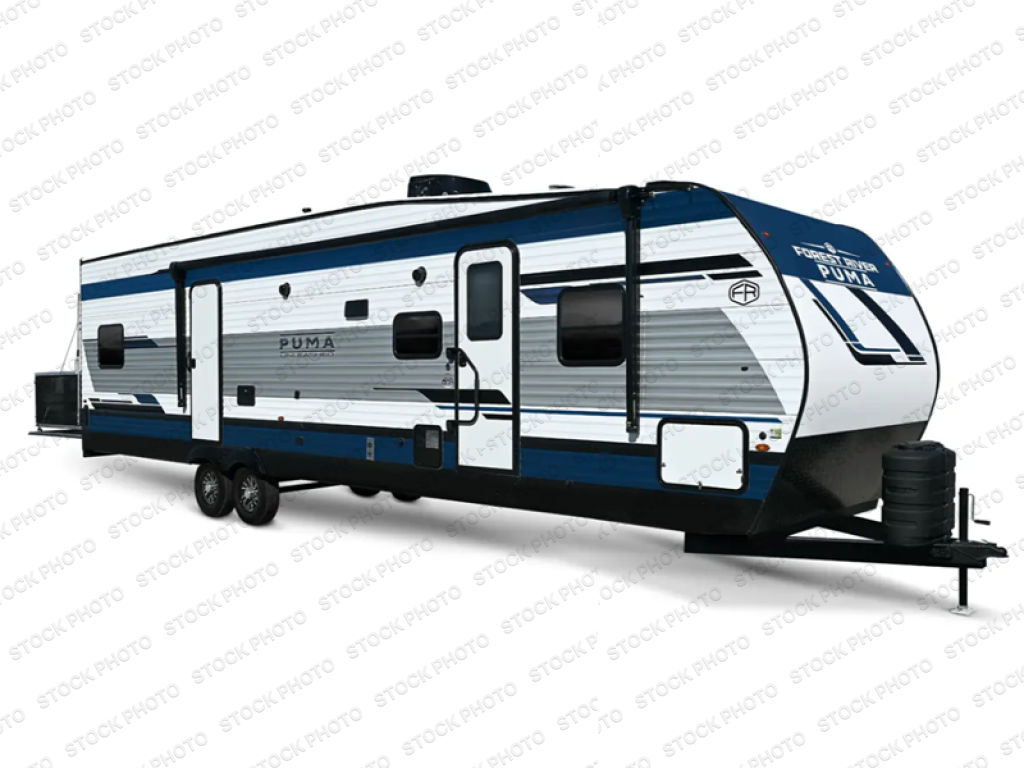 The most spacious toy hauler travel trailer in the Puma Unleased lineup, this unit is ready for adventure when you are! There are dual entry doors, one of which leads to the 13' separate garage. Here, you'll find 62" rollover sofas, an optional queen bed electric lift, plus a 7' 3" ramp door with spring assist for easy unloading. The walk-through bath will be easily accessible for everyone to use, and the main living room is shared with the kitchen so everyone can gather together when dinner is being made. A 21" stainless steel oven comes standard in the kitchen, along with a stainless steel microwave and an 11 cu. ft. 12V stainless steel residential refrigerator. When you're ready for bed, the front private bedroom with an RV queen bed will provide a great night's rest, and there are dual shirt closets to keep your clothes wrinkle-free.