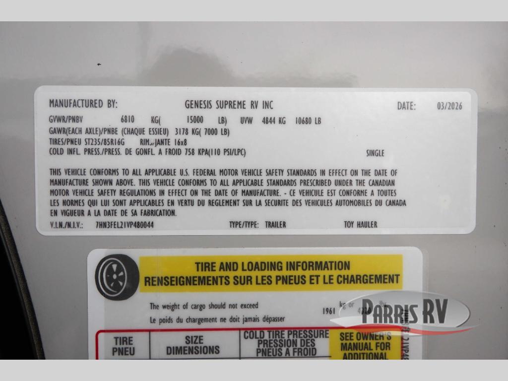 Genesis Supreme Vortex toy hauler 2815VT highlights: