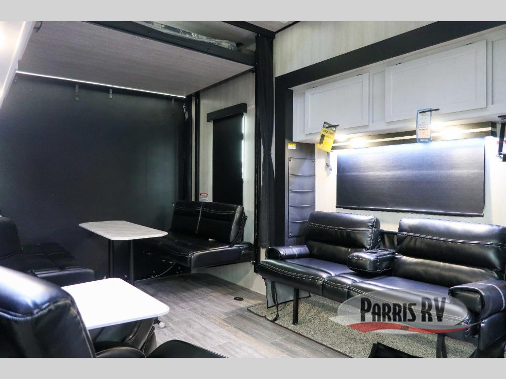 This unit is just like model 2815, except features a higher profile with plenty of room. You can store your ATVs in the 15' 11" garage on this Vortex toy hauler and use the 7' laminated ramp door with beaver tail to get them out. For other gear, there are slam-door storage compartments, and you'll also be able to put fresh products in the 6-cubic foot double-door refrigerator. When you get hungry, use the three-burner range to make a fresh batch of French toast, and when you get tired, use the RV queen bed, power queen bunk, and sofa bed to get some rest. You can also add space to the interior by adding the two optional slides.