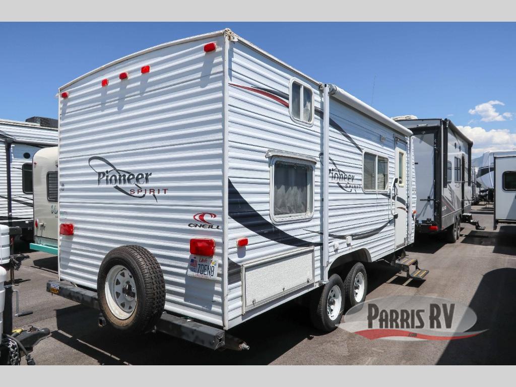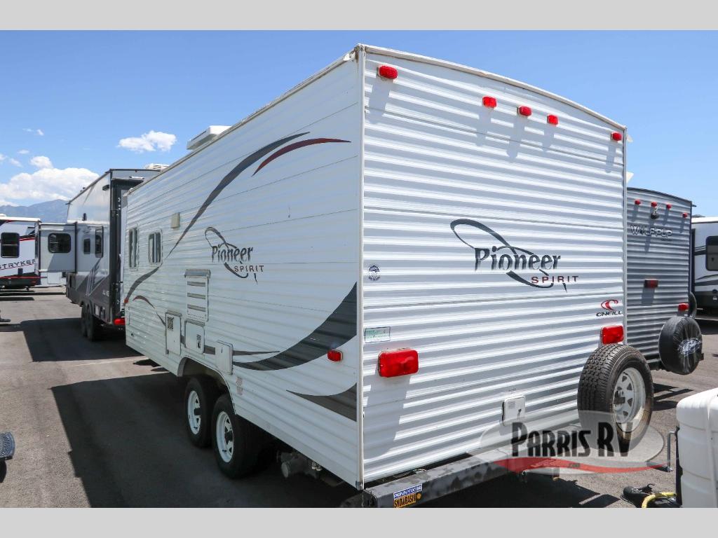 Pioneer Spirit Travel Trailer w/Rear Corner Tub/Shower & Toilet, Rear Corner Double Bed w/Shirt Wardrobe & Opt. Bunk or Combo Bunk w/Pads, Pantry/Wardrobe, Booth Dinette w/TV Shelf, Refrigerator, 3 Burner Range, Double Kitchen Sink, Sofa Bed, Entry Cabinet, Overhead Storage Cabinets & More!