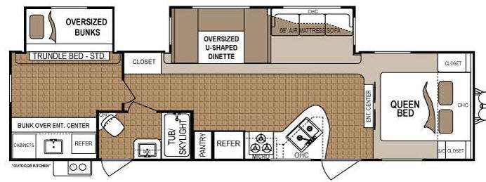 Made for year round use!Double Slide Bunkhouse Denali Travel Trailer by Dutchmen w/Rear Oversized Bunk Bed Slideout w/Trundle Below, 4th Bunk Above Ent. Center, Closet, Bath w/Private Entry, Tub/Shower w/Skylight, Sink & Toilet, Slideout Oversized U-Shaped Dinette & Air Mattress Sofa, Ent. Center, Pantry, Refrig., 3 Burner Range, Dbl. Kitchen Sink, Overhead Cabinet, Front Queen Bed w/Closets Including 1 Shirt Closet, Rear Outdoor Kitchen w/Refrig., Sink, 2 Burner Cooktop, Storage and More!