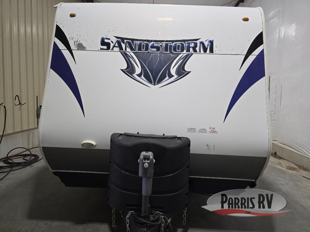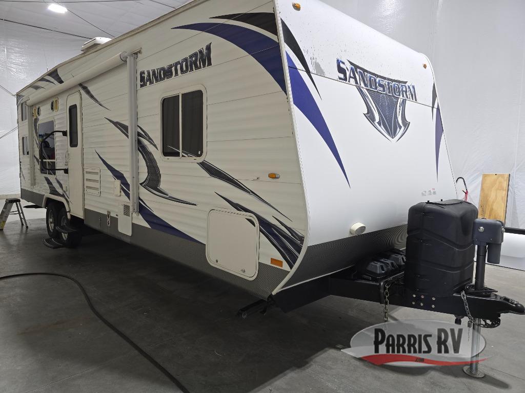Sandstorm SLR Toy Hauler Travel Trailer, Rear Easy Lift Sport Ramp, Dual Electric Beds, Fold Down Sofa, Pedestal Table, Fold Down Dinette, 3-Burner Range, Microwave, Dbl.Kitchen Sink, Toilet, Glass Shower,Queen Bed w/Dbl. Wardrobes, Lav., Pantry/Linen, Refrigerator, TV, Overhead Cabinets Throughout, Pass Thru Storage & Much More. Available Options May Include: Rear Sofa, Swivel Chairs.