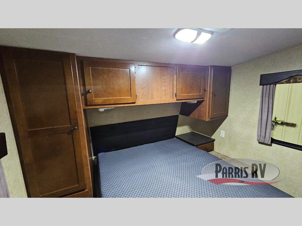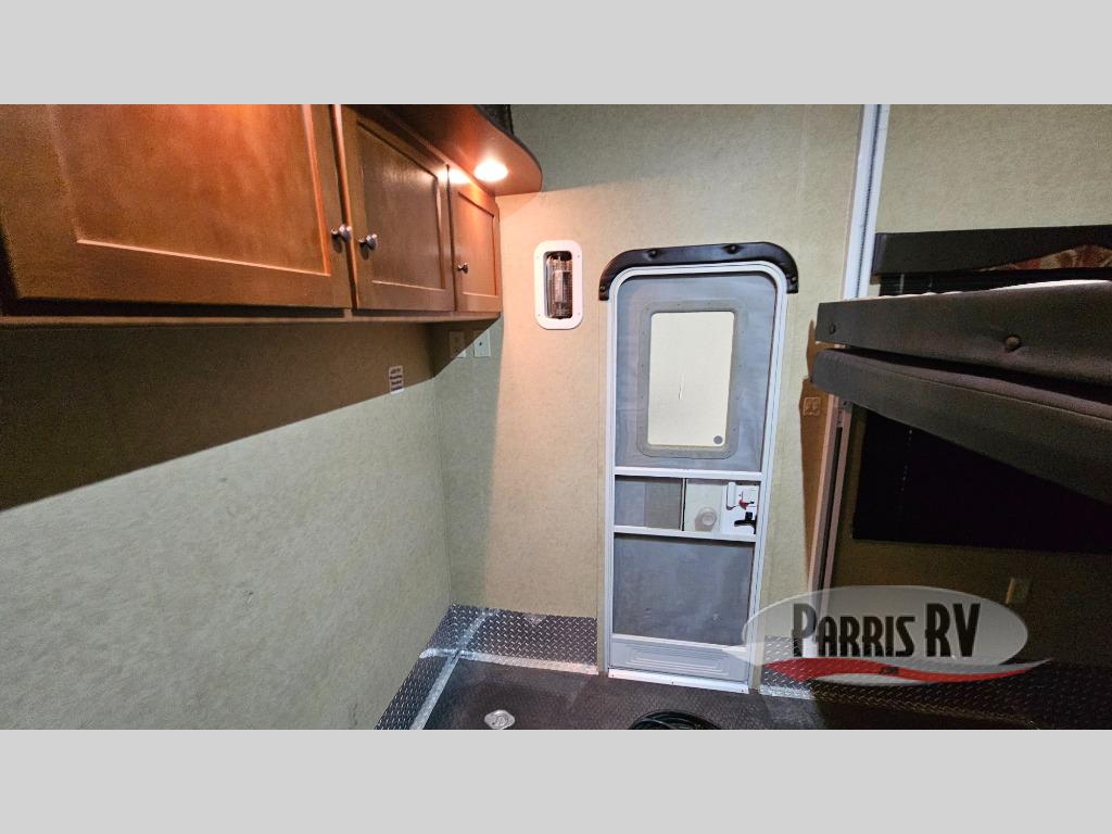 As you step inside the main living area entry door you will see a front bedroom with queen size bed. A nightstand with shirt closet on one side, and a wardrobe on the other side of the bed. There is an overhead cabinet above for added storage, and dual entry doors for access.