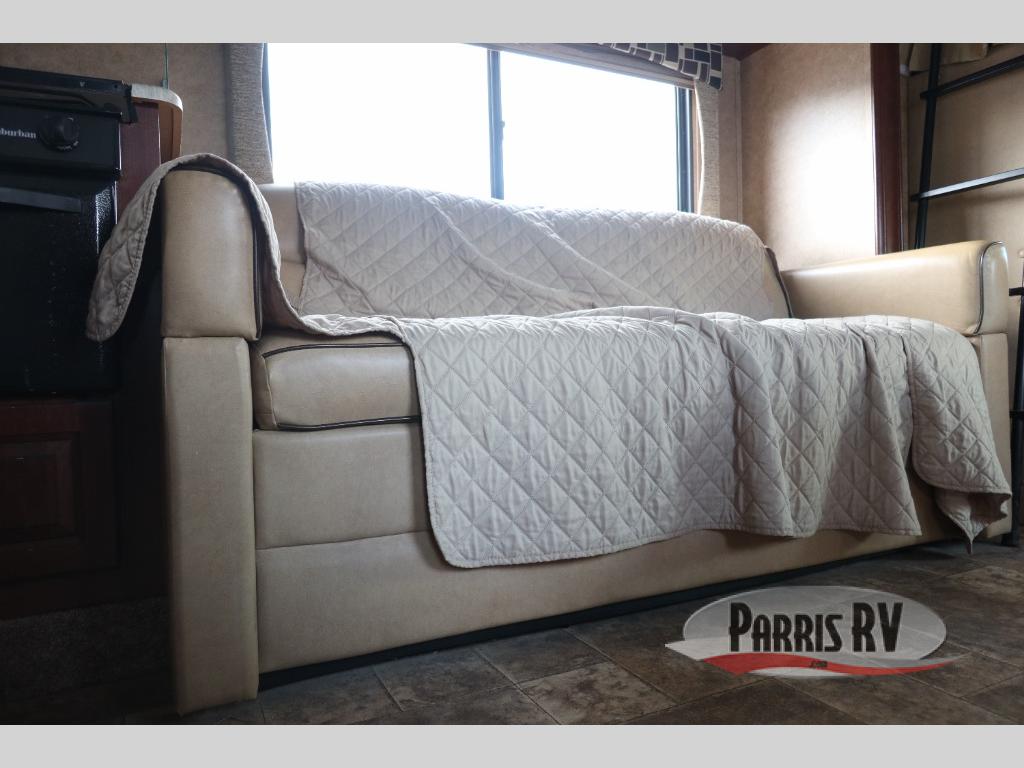 As you move toward the back of the Forester 3171DS, a private kid's area offer a kid's sofa sleeper with a flip-down 28" x 72" bunk above. There is storage and space for an optional TV on the opposite wall.