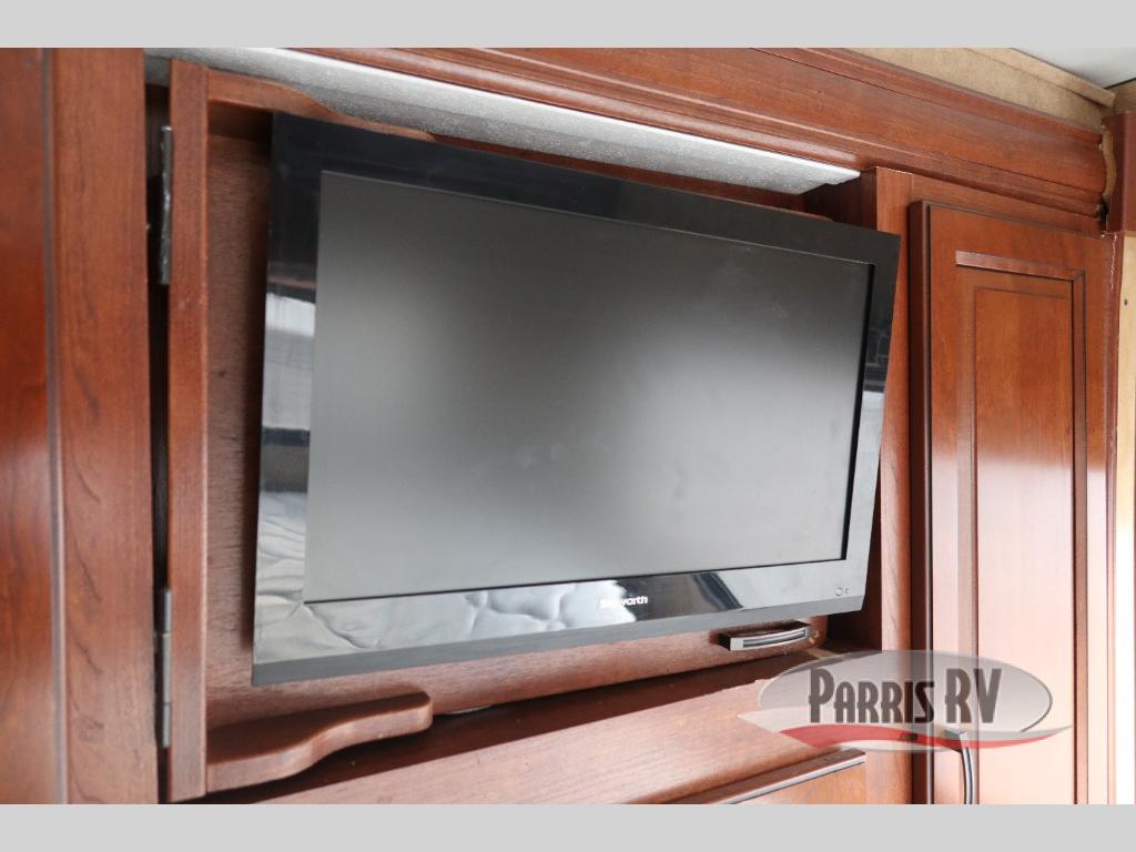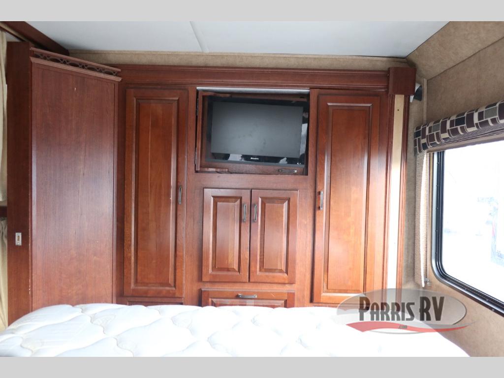 A rear queen bedroom features overhead storage cabinets at the head of the bed. Double wardrobes and drawers are across the room with space for an optional TV.