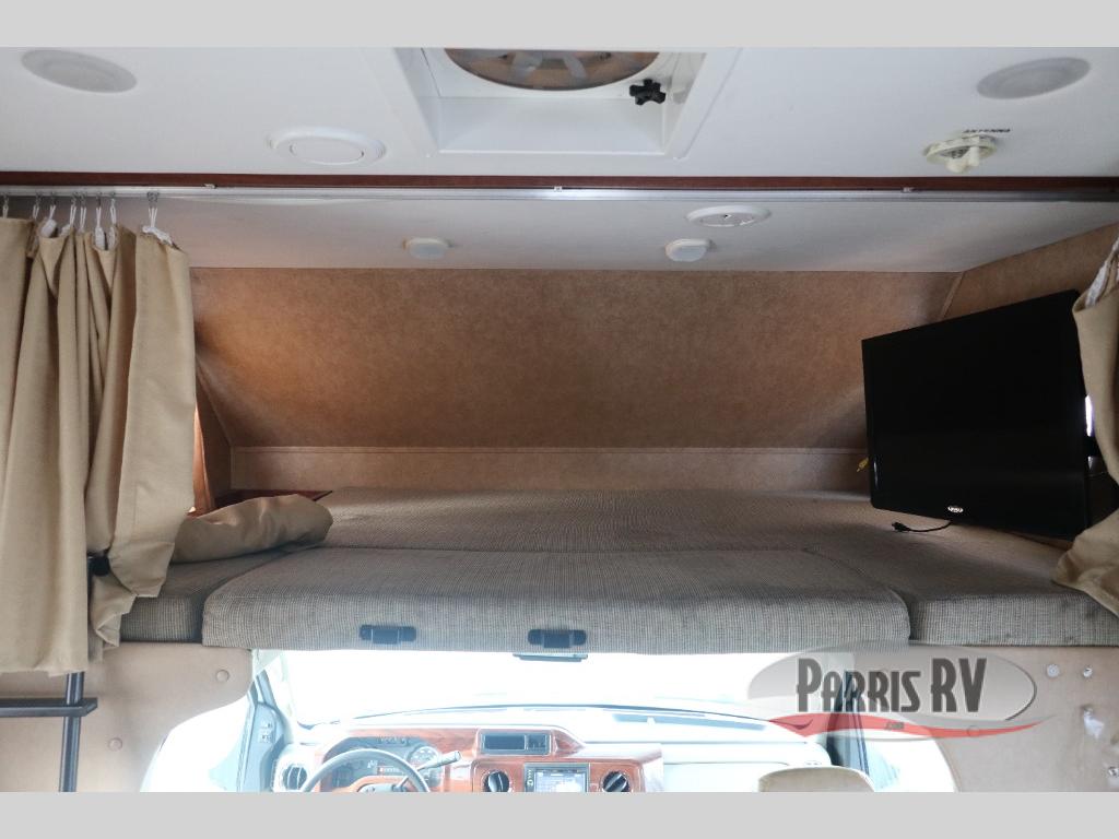 As you step inside, a dinette with overhead cabinets is located to your right. Over the cab, a standard 54" x 80" bunk with storage offers extra sleeping space. You may choose the optional over cab entertainment center with optional deluxe TV.