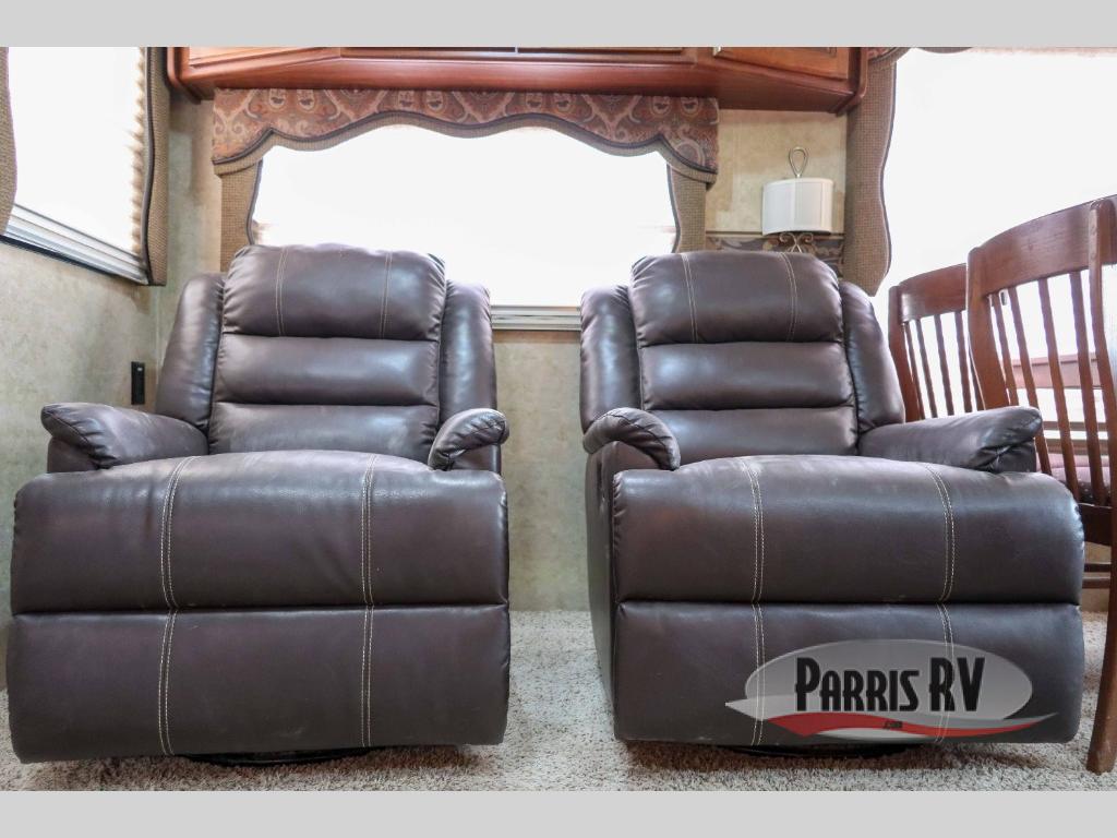 Back down in the main living space find a slide that is to the left of the door featuring two swivel recliners and a booth dinette. Opposite there is an L-shaped sofa with hide-a-bed option. You will also enjoy the overhead cabinets for more storage. The entertainment center features a 40" TV with storage cabinets both above the TV and below.
