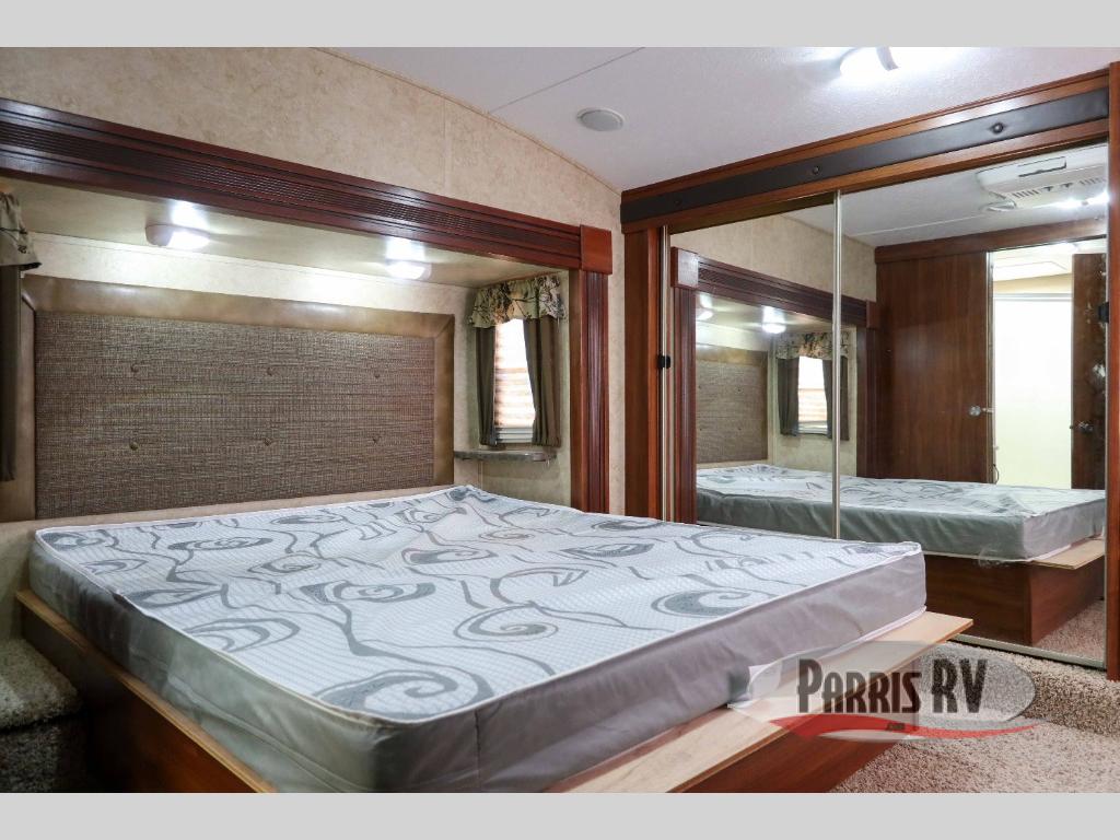 As you enter notice the handy coat closet straight ahead just beyond the steps that lead up to the front bedroom and master bath. The bedroom offers a queen size slide out bed, and a window with storage beneath along the opposite wall. There is a nightstand and a full height wardrobe with sliding doors. There is a wardrobe with washer/dryer prep up front as well.