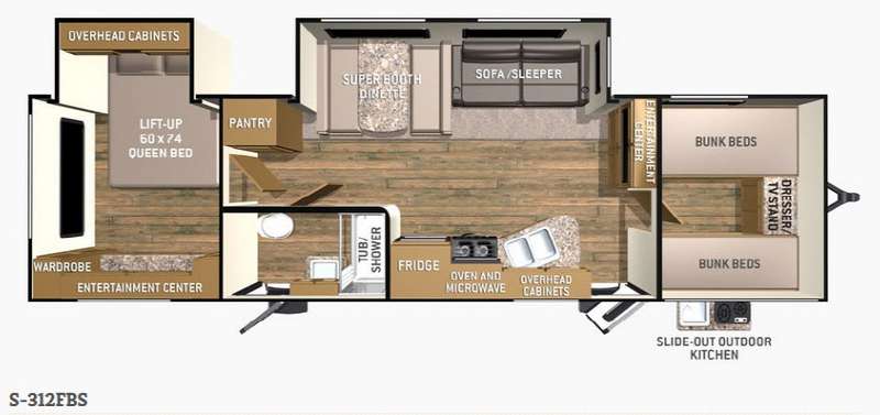 Make this Shadow Cruiser travel trailer your new home on wheels. Model 312FBS features dual slides, dual entry doors, a slide out outdoor kitchen, and a set of bunks that the kids will surely love!