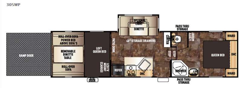 In the rear of the fifth wheel, you will find two roll over sofa's with a power bed above the sofa's and a removable dinette table. In the corner of the cargo area there is a LCD mount. The patio door separates the cargo area from the kitchen/living areas. In the kitchen area you will find a refrigerator, microwave, three burner range, double kitchen sink, and a u-dinette/sofa slide. There is an entertainment center in the corner. Above the cargo area the loft queen bed provides additional sleeping space.