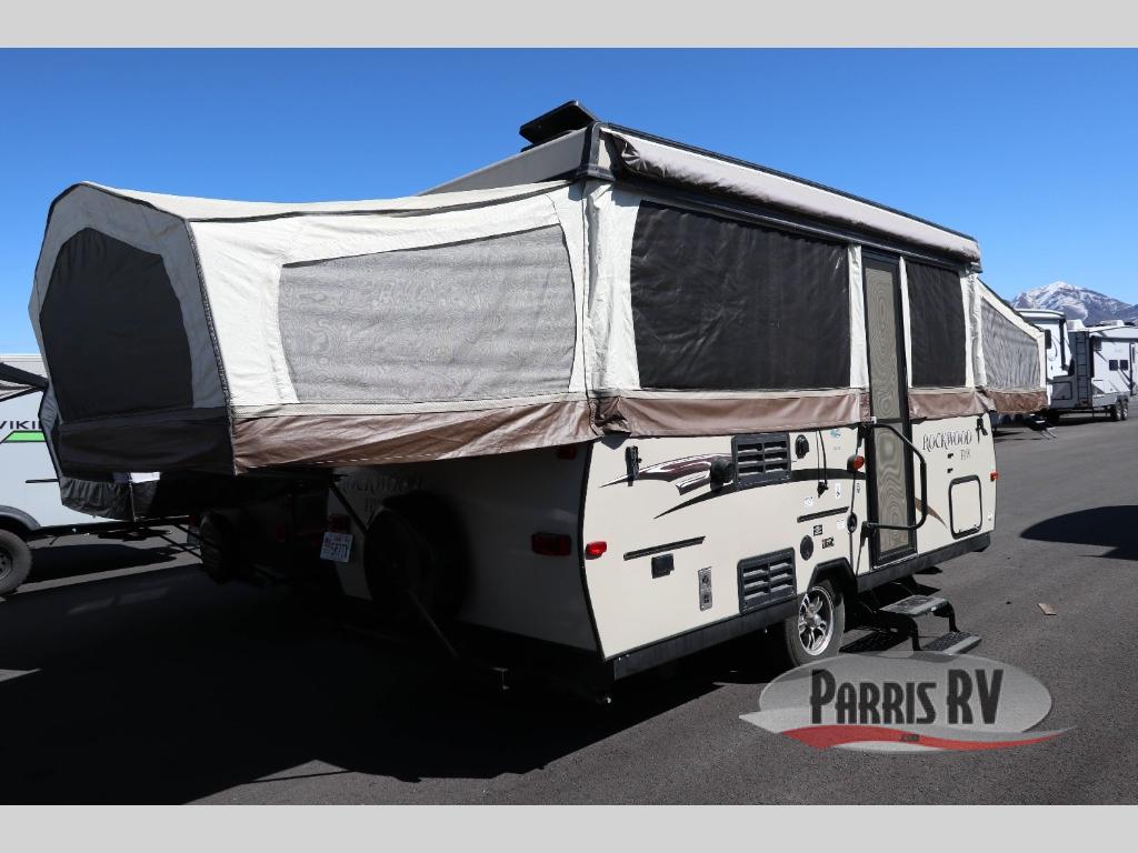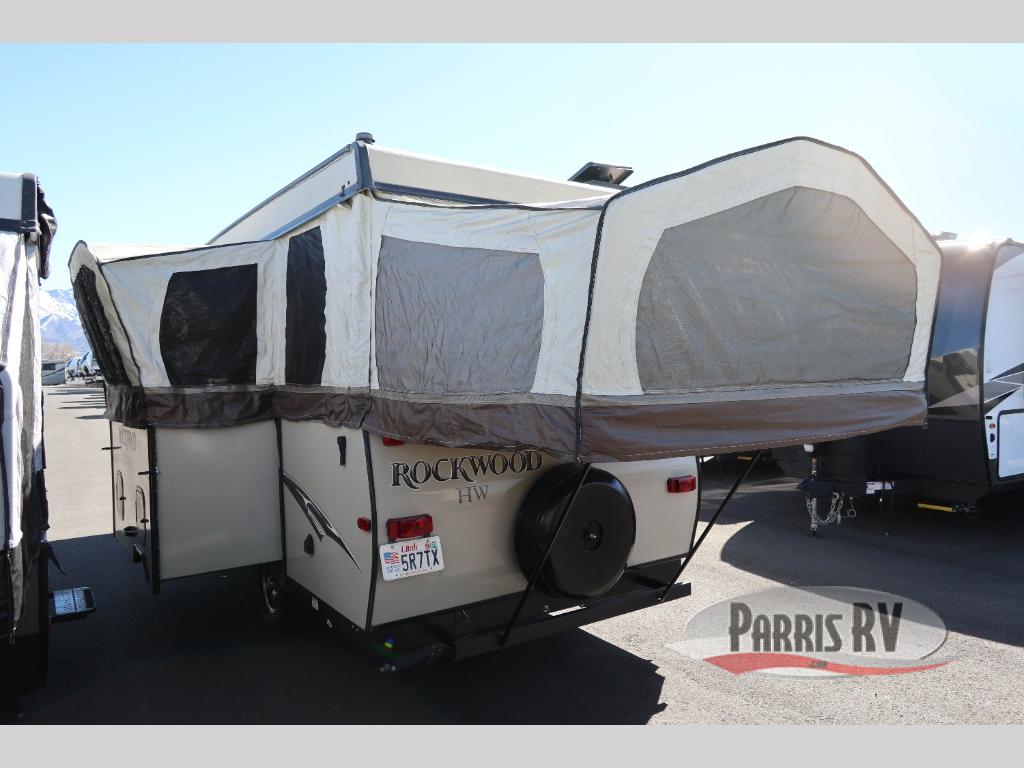 The Rockwood High Wall Series HW276 is a folding pop-up camper from Forest River. It includes a rear queen tent end bed and a front king tent end bed.