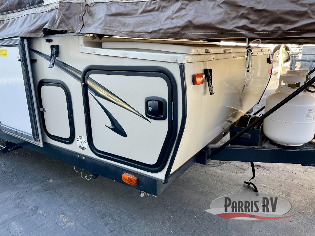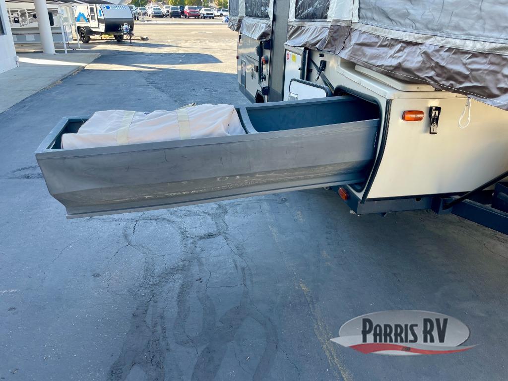 Outside this folding pop-up camper is sliding storage for easy access, an awning and a RVQue gas grill.