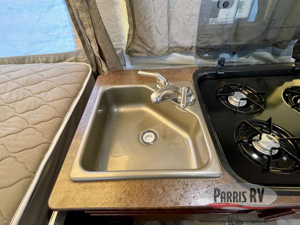 As you continue around, a 72" x 50" booth dinette is located within the single slide out. Back inside, one back corner provides a swing level galley with a cabinet, three burner range top and single bowl sink. An optional refrigerator is under the three burner range.